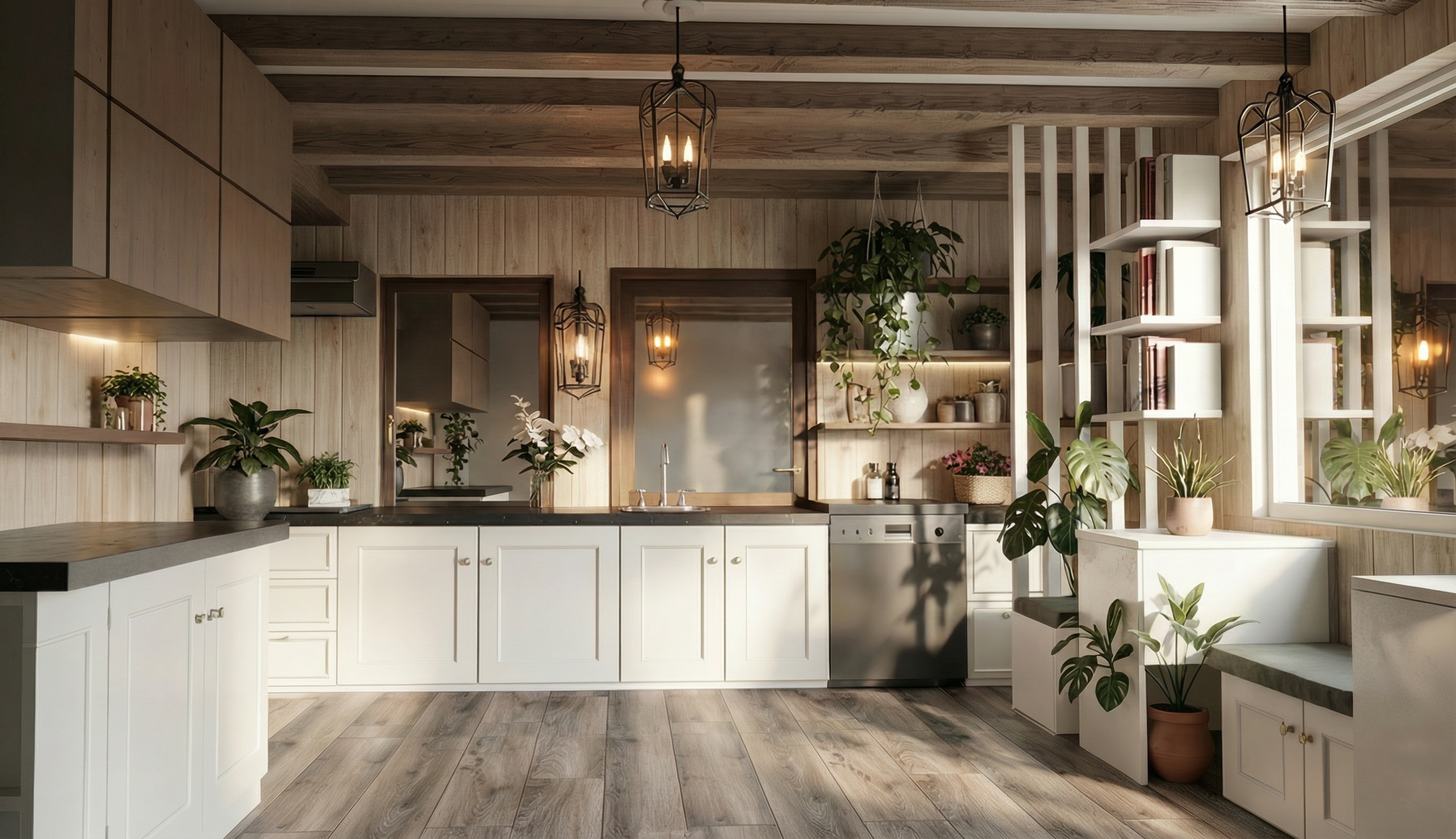 render this room in a romantic morning light comings in from the garden make the cabinets and the ceiling above a pastel blue and replicate the detail on the first pair across all of them with an oak church pew on the left and red flowers on the table next to it make the floors a matte brown brick in a grid pattern
