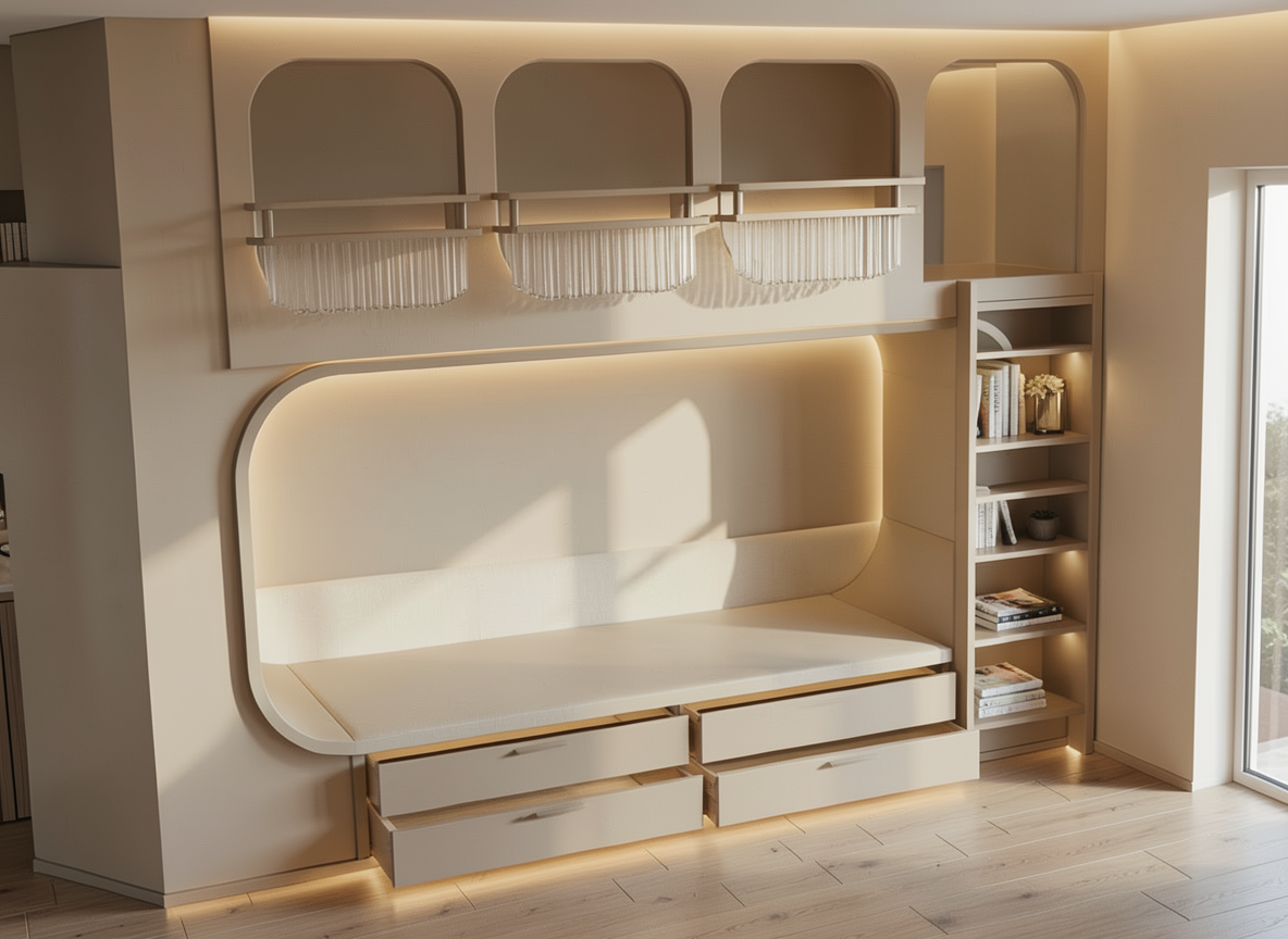 exterior shot round out the edges remove the middle hanging shelves make it a darker wood tone add mid century modern knobs to all the drawers and cabinet doors