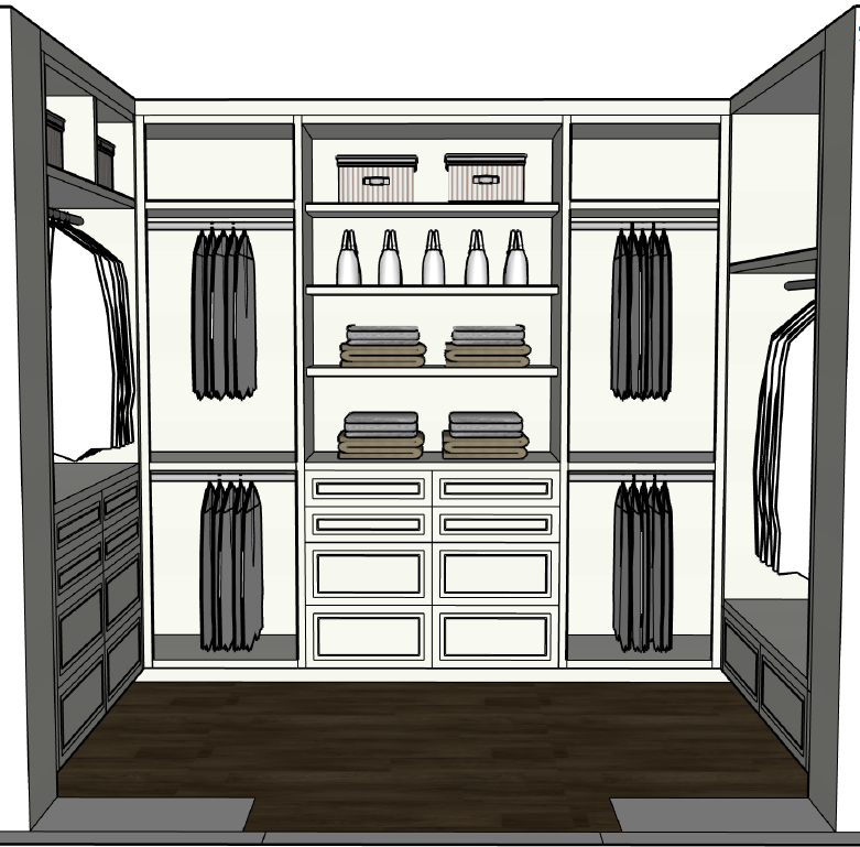 interior shot luxury closet with warm walnut flooring and white cabinetry satin brass handles and closet rods lighting inside cabinets