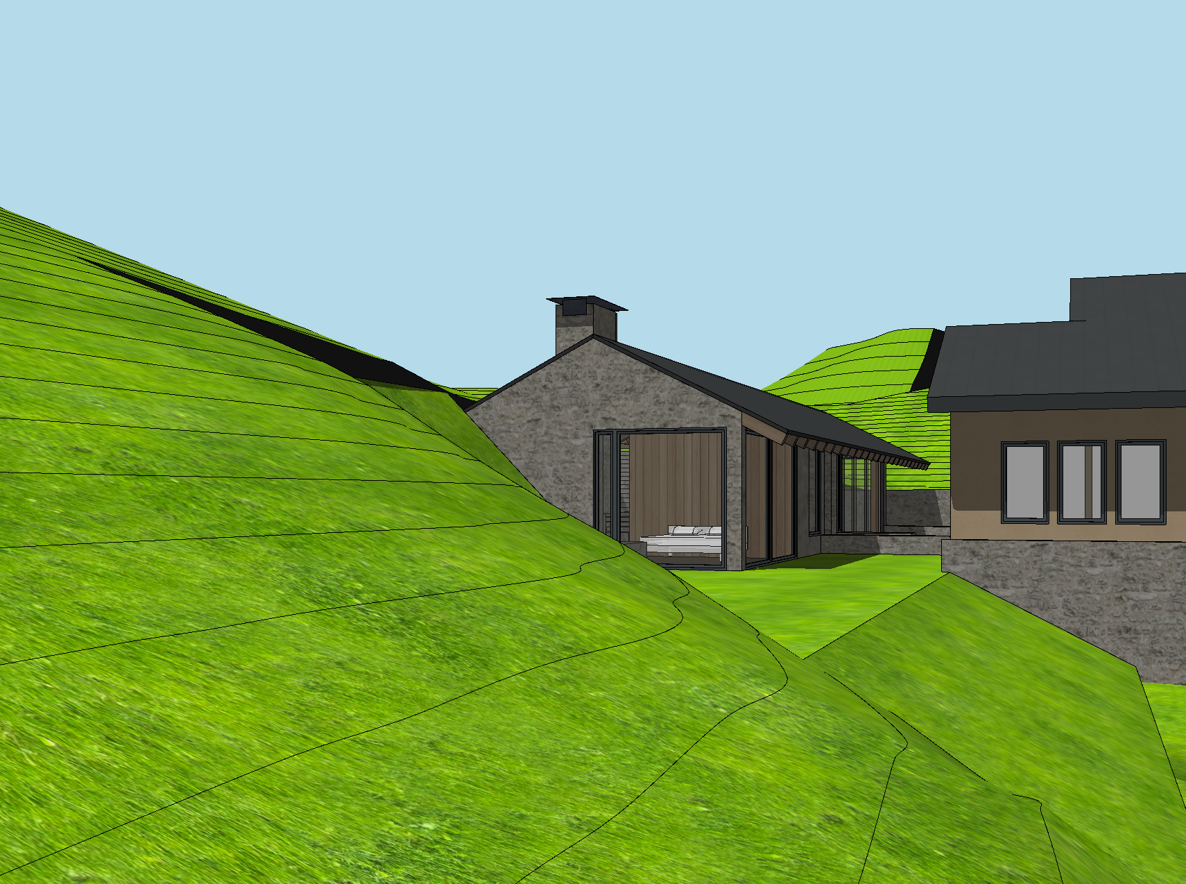 landscape hillside with sagebrush and tall wild grasses brown drystack stone walls corten standing seam metal roof