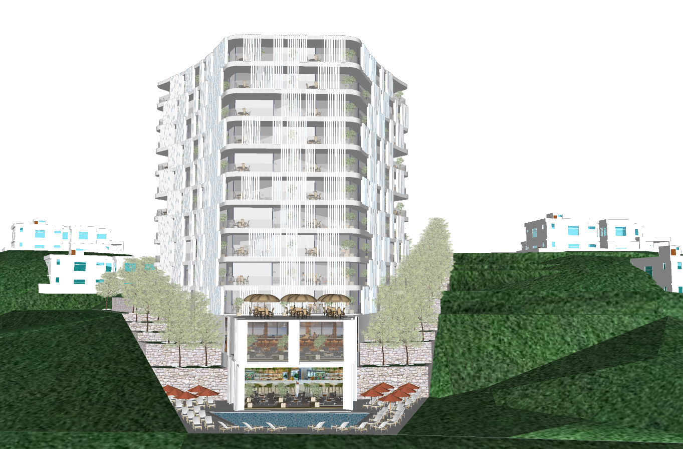 render a modern elegant apartment building nestled in lush green hills the building features sleek white facade elements with vertical accents and soft balconies highlight vibrant green hills surrounding the structure with the hillside setting ensuring a serene and peaceful atmosphere include small residential buildings painted in white and sky blue scattered around adding charm to the scene at the base depict a luxurious pool area with azure water surrounded by chic lounge chairs with rustic red umbrellas establish a clear blue sky as the backdrop to enhance the tranquil and sunny ambiance