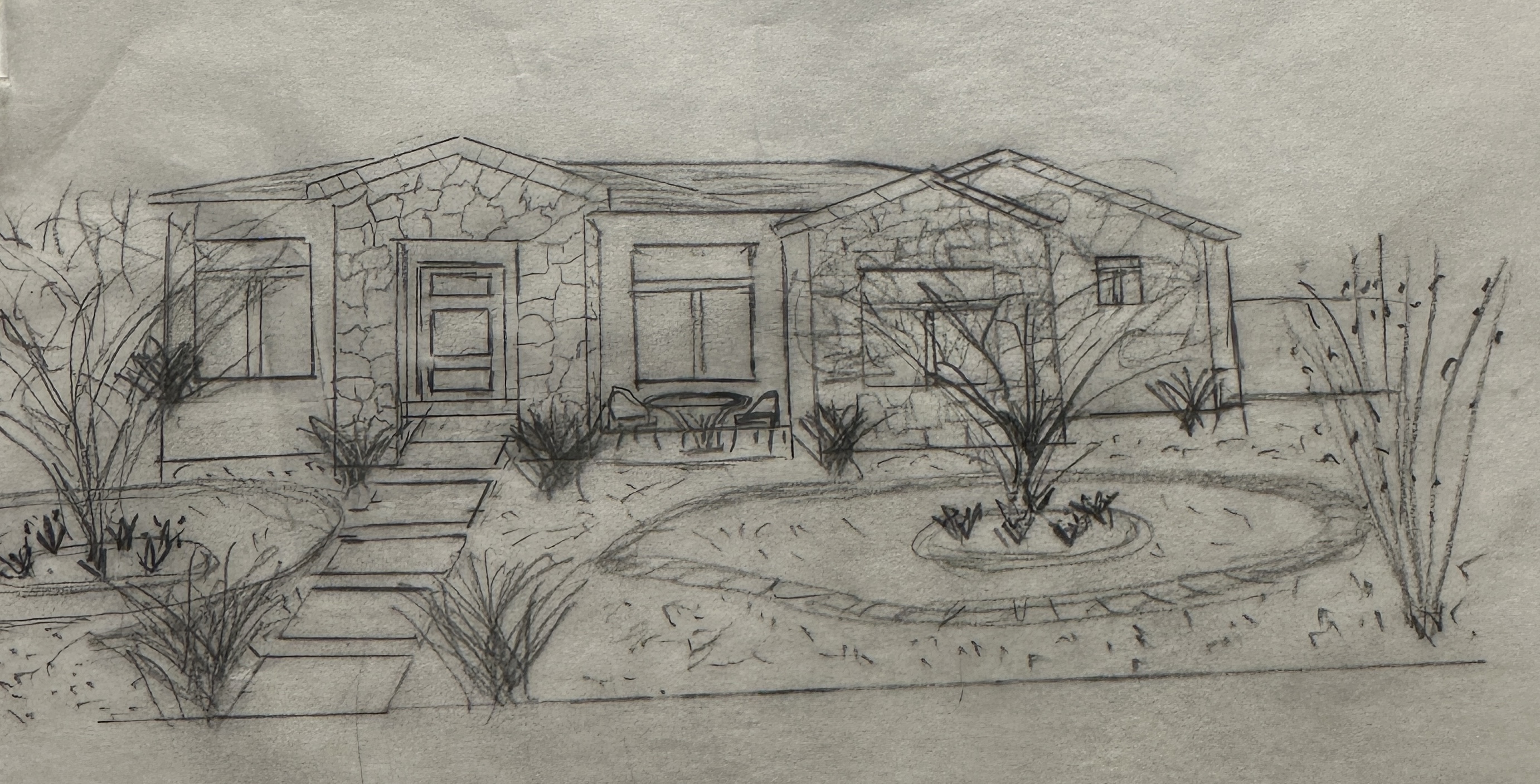 a manicured lawn around 2 chaste trees with brick border draught tolerant yucca and ocotillo cactus santa fe brown 1 2 stone around grass house color white with whitewashed stone on exterior stone pathway leading to the entrance