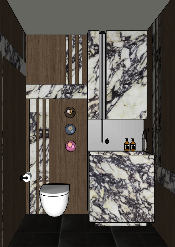 no sunlight please softly light up the three spheres on the wall as light fixtures but keep the color the material above vanity is all glass do not light the toilet paper