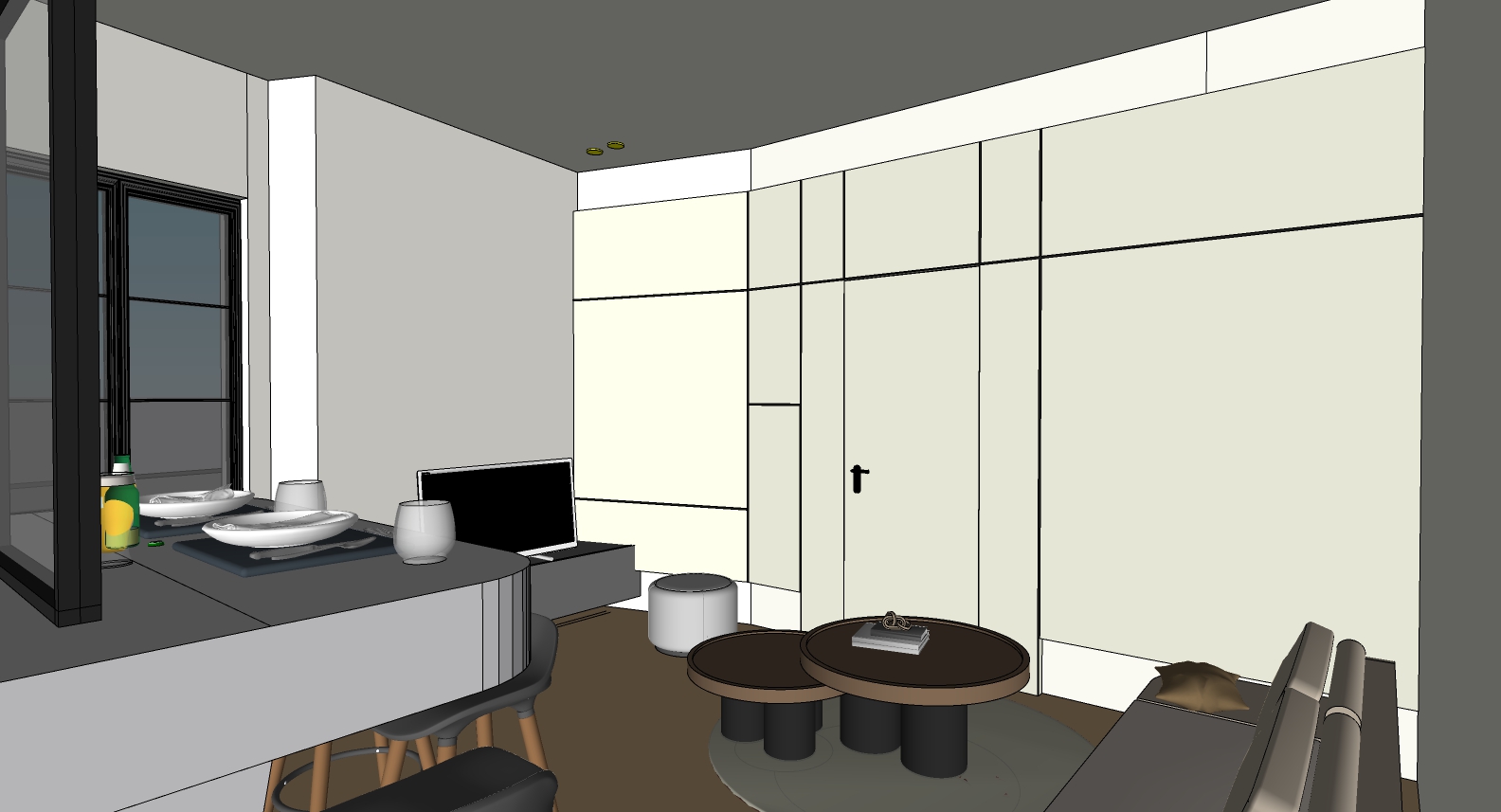 modern and minimalist living area with elegant furnishings flush fitting door white walls and herringbone parquet flooring flat false ceiling with spotlights soft lighting with ambient and artificial light that creates a relaxing atmosphere