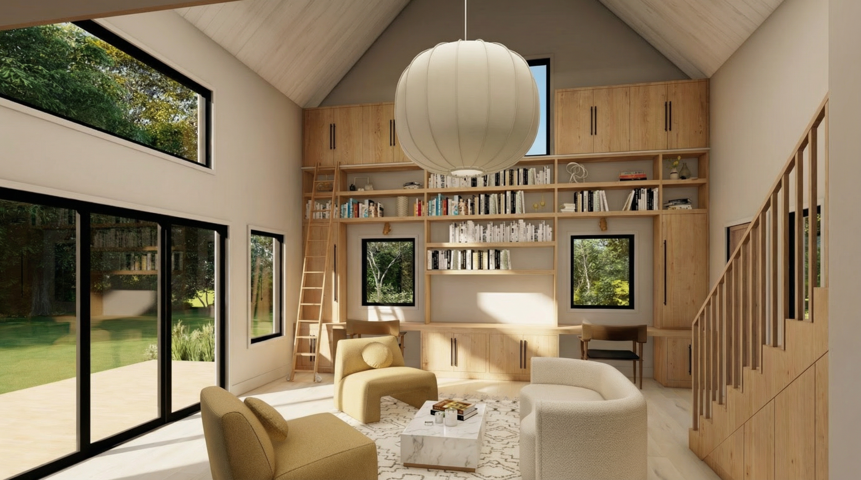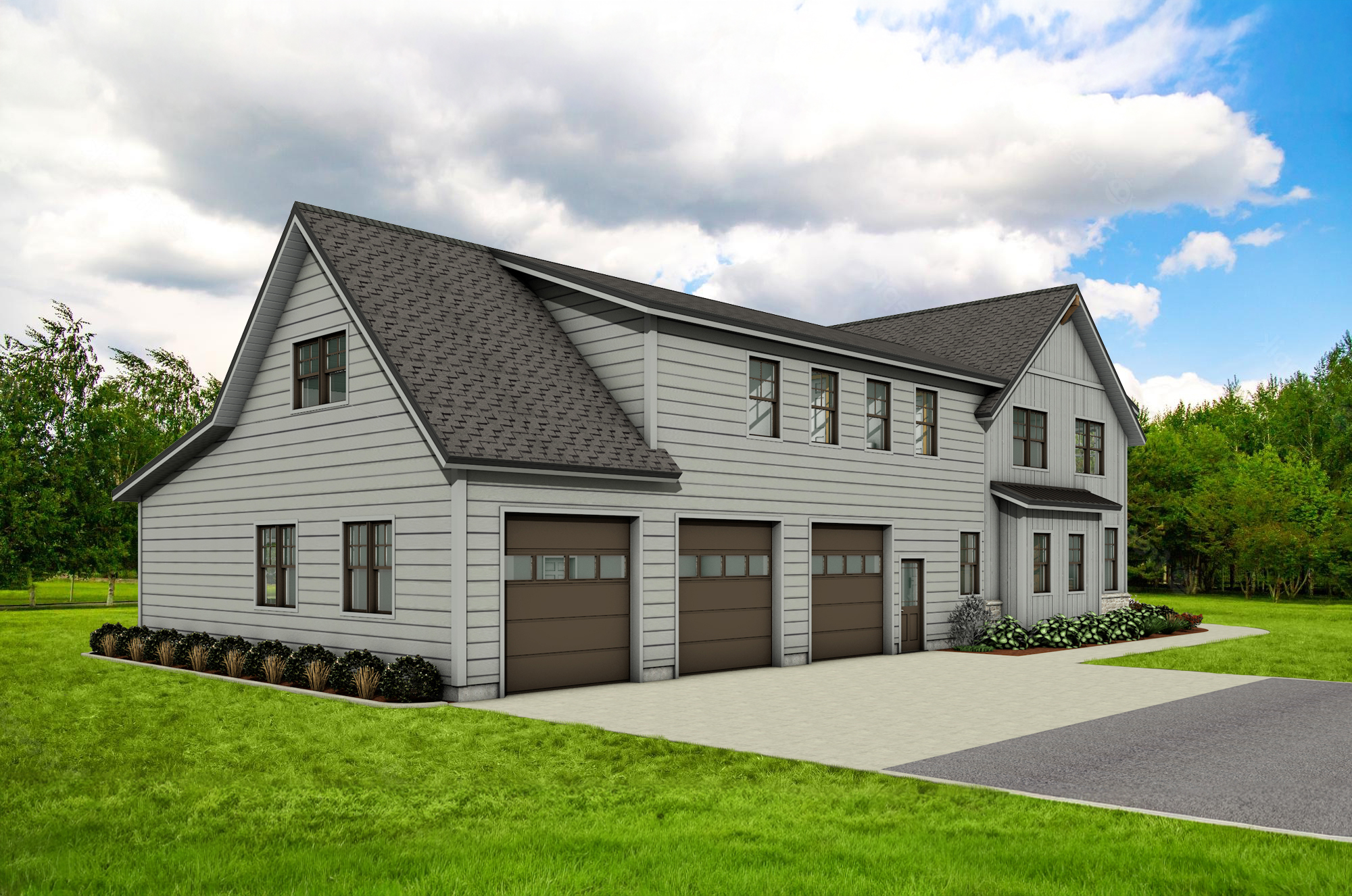 a modern house retain the exact structure colors and window arrangement rooflines siding foundation height and proportions exactly as shown in the reference image integrate into the terrain there is a lush dense forest of mixed hardwoods that are mostly on the sides of the image add cooler afternoon sunlight subtle dappled highlights across the siding and grass create ultra realistic lighting crisp shadows detailed textures in the siding and glass reflections and an overcast sky show only a few lights visible inside render in hyper realistic architectural visualization quality 8k resolution add a driveway tying into the concrete garage door apron make it the fall season add realistic landscape