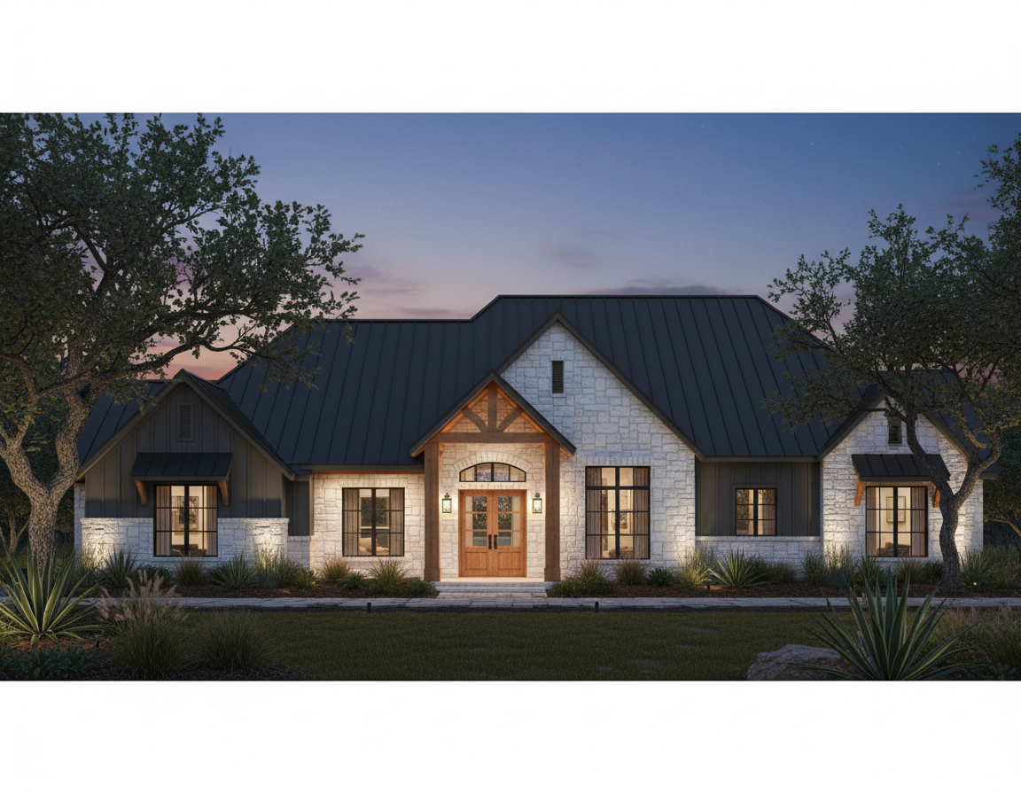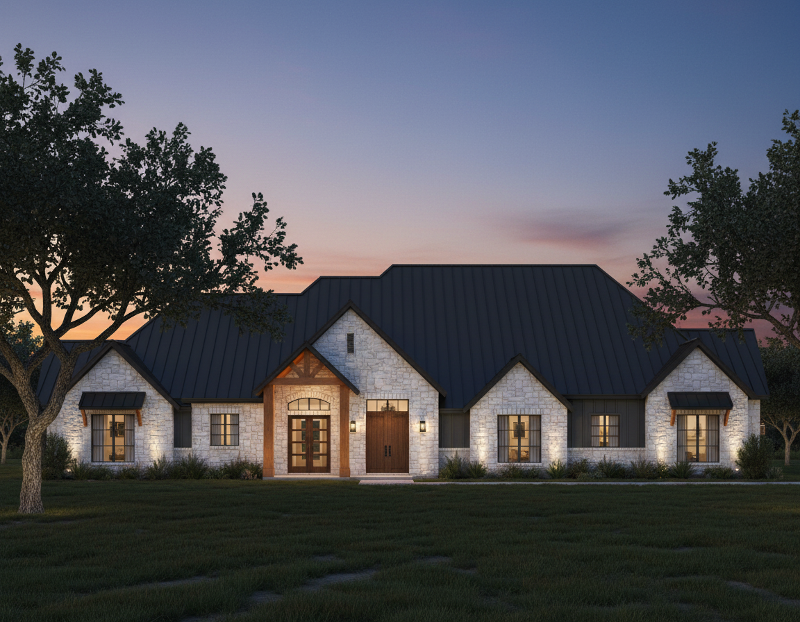 make exterior wood board and batten and roof to be dark brown metal