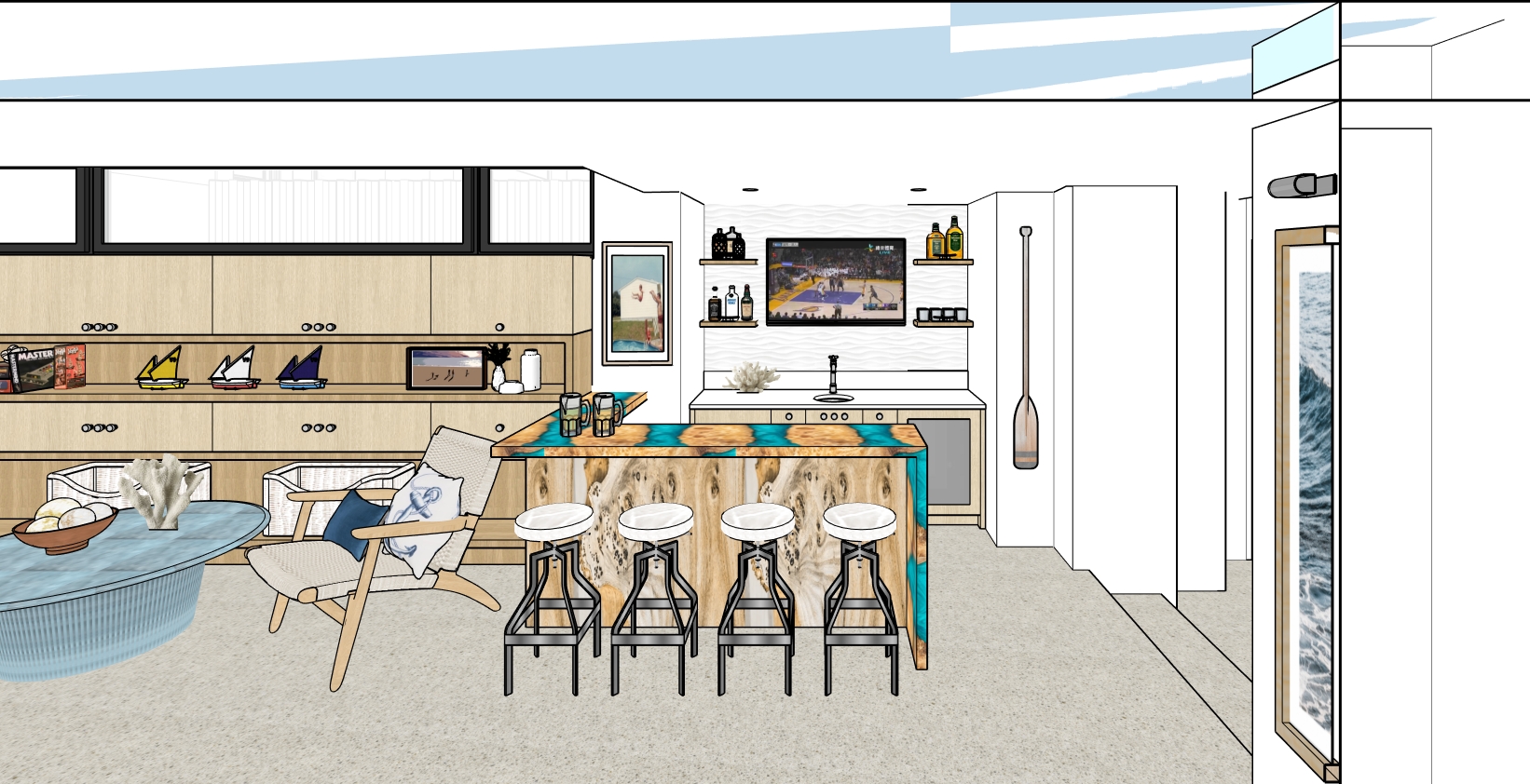 make realistic make bright and airy bar wood countertop to have some blue epoxy fill concrete floor to be light sand colour not open to sky white ceiling over room