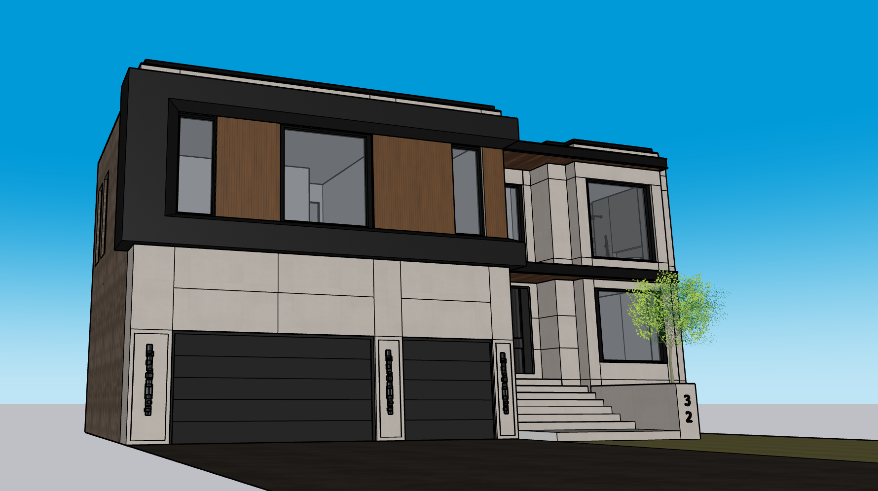 modern exterior shot modern house front elevation main fa ade light gray precast stone side walls brick above the garage doors black porcelain on a sloped surface other black porcelain sections combined with wood tone fluted pvc panel canopy black steel with cedar underside matching panel tone black aluminum windows realistic lighting sunny with some clouds show neighboring houses architecture