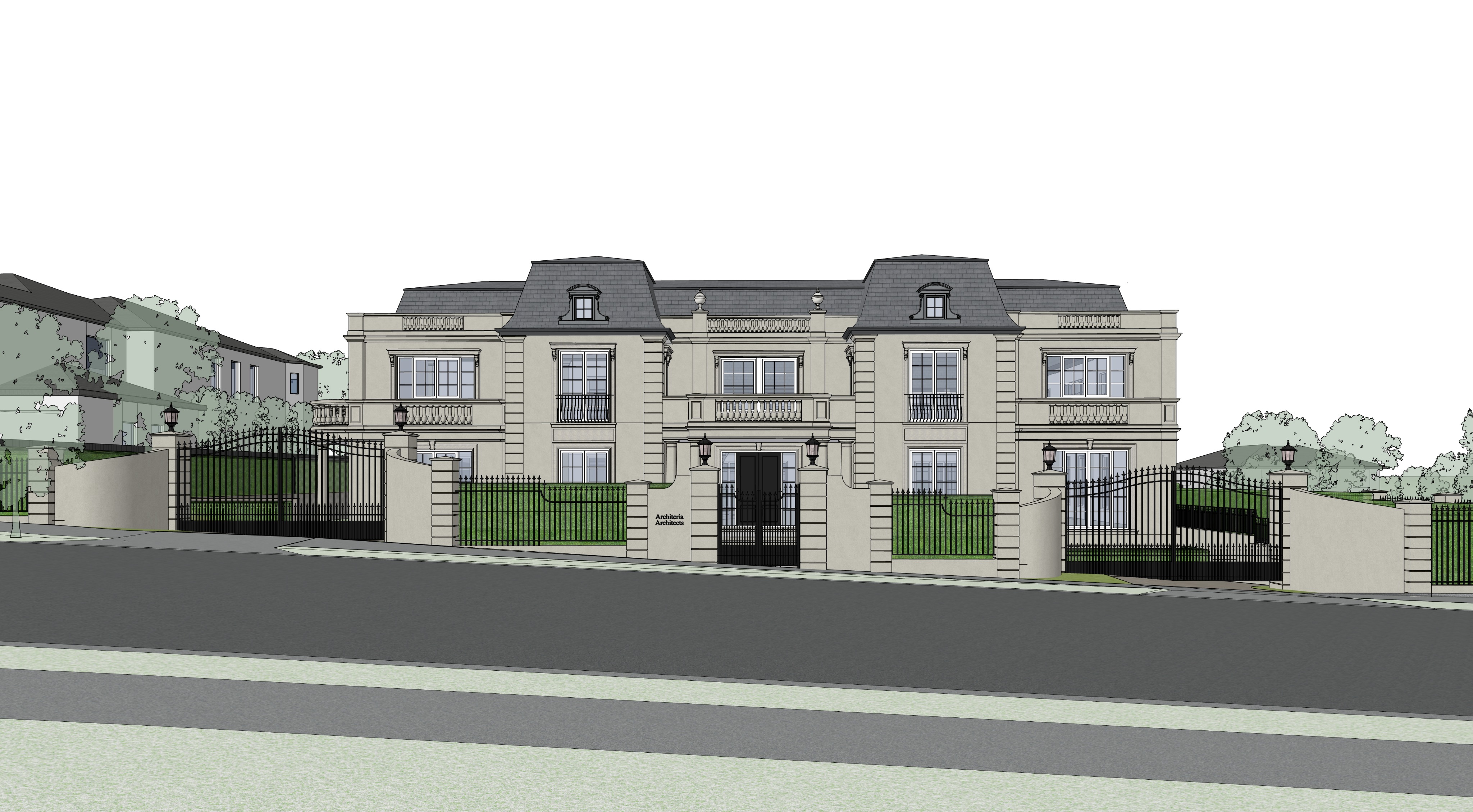 photorealistic render classical home high green hedges fence award winning off white window frame in the late afternoon slate roofing wet road