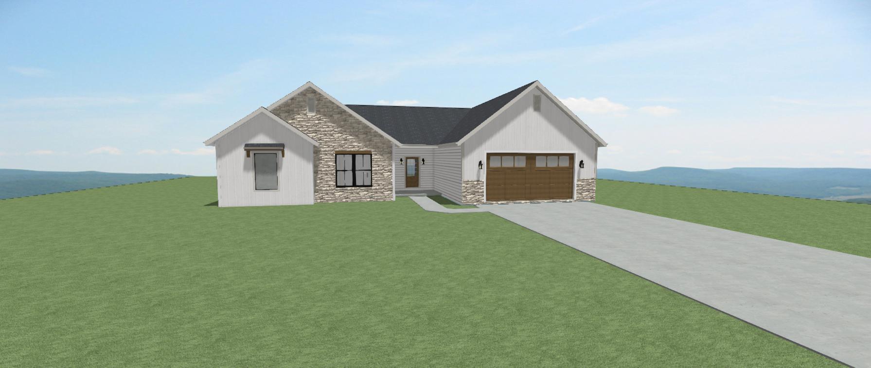 make photorealistic outdoor scene of this home setting midwest ohio small subdivision the lot is a little higher with tasteful landscaping and lawn black windows