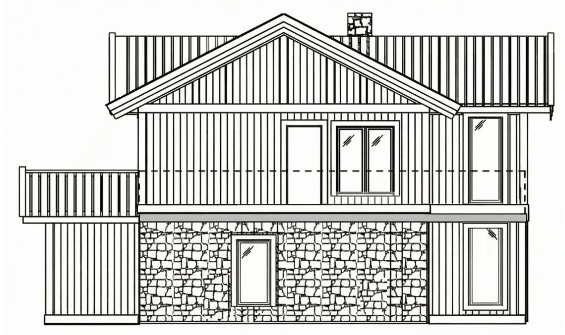 g r en bild av cad ritningen observera att utbyggnaden p v nster sida p huset r en utbyggnad med tak markeringen med streck p andra v ningen visar en balkong som slutar i v nstra h rnet d r stenfasaden tar slut balkongen g r hela v gen fram till h ger kant p huset r cket ska vara av svart metall landskapet som omger huset ska vara ett vinterlandskap