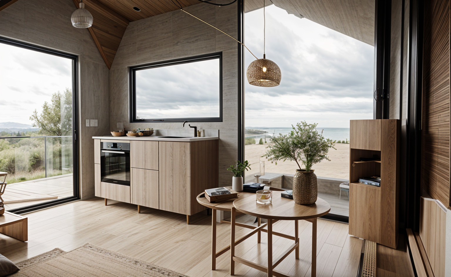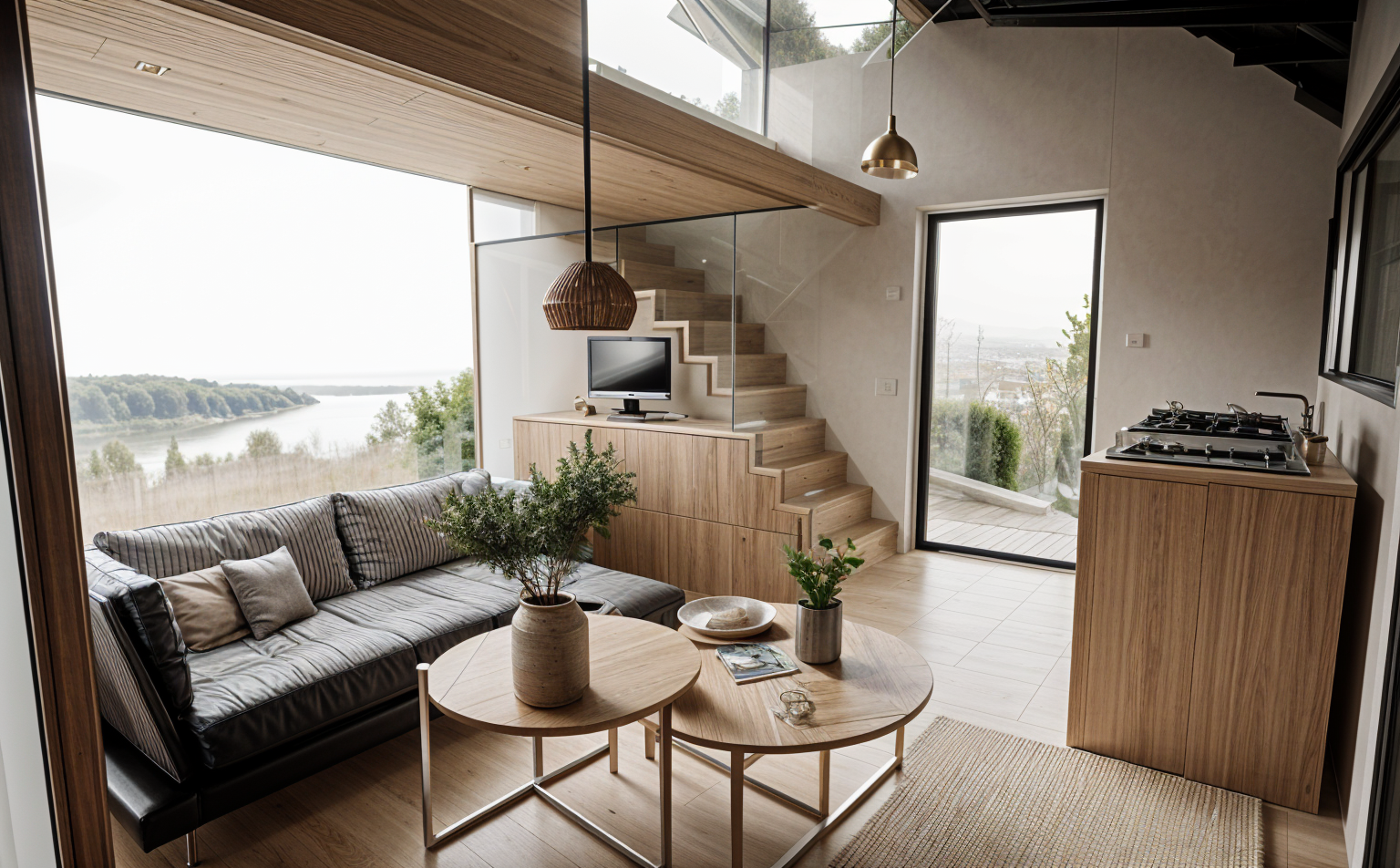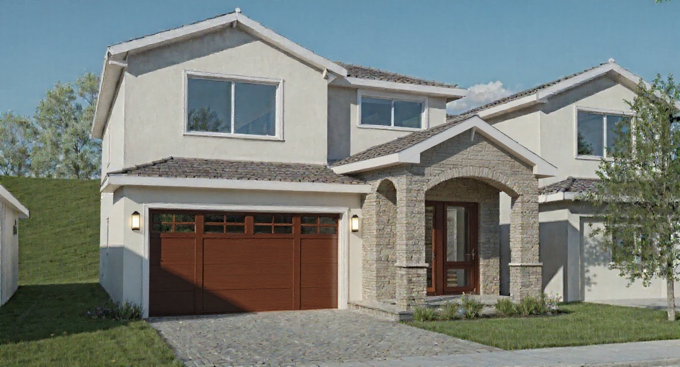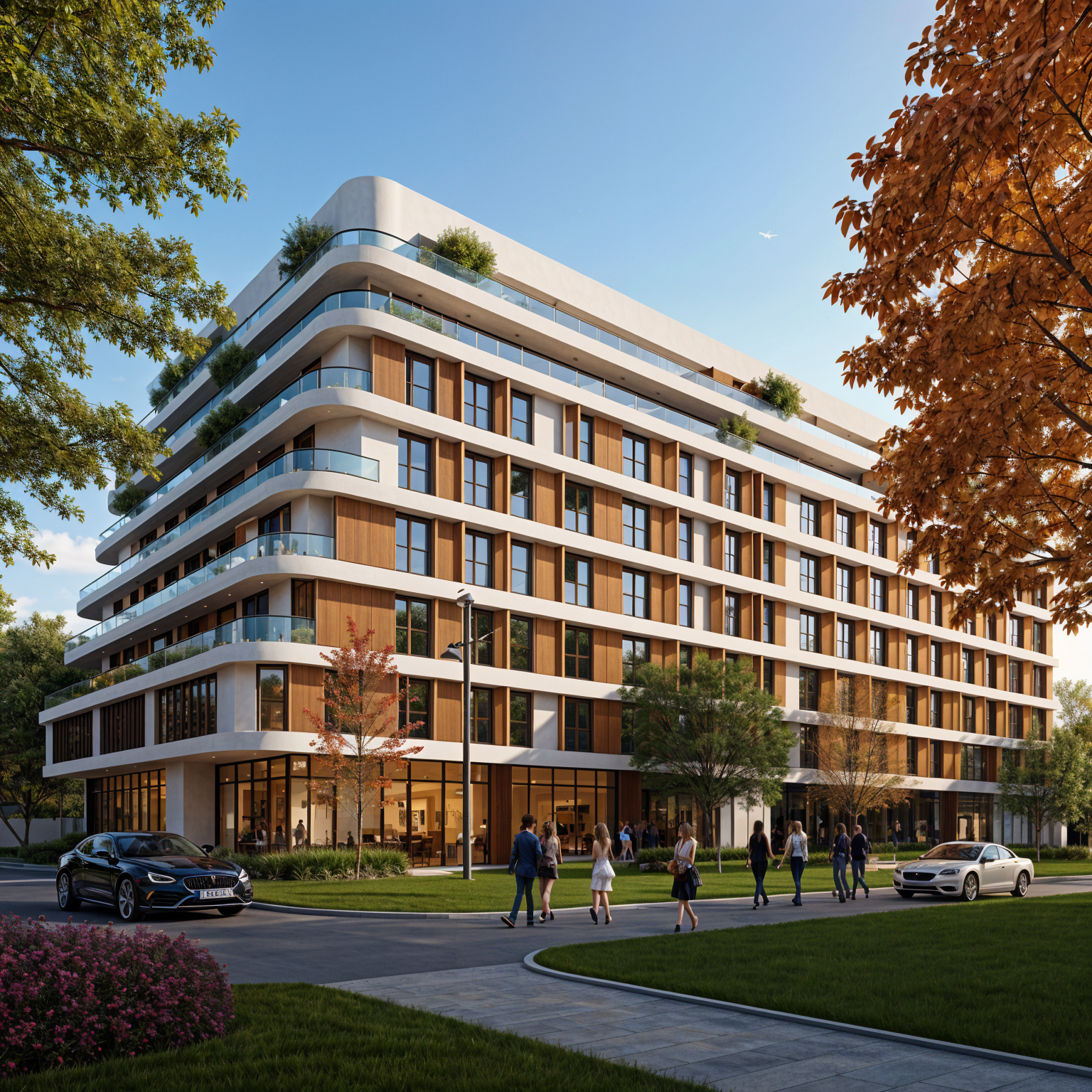 enhance the scene with have photorealistic materials and keeping the original colors the atmosphere should be serene and inviting with a bright blue sky filled with soft fluffy clouds add low lying landscape native shrubs in green areas