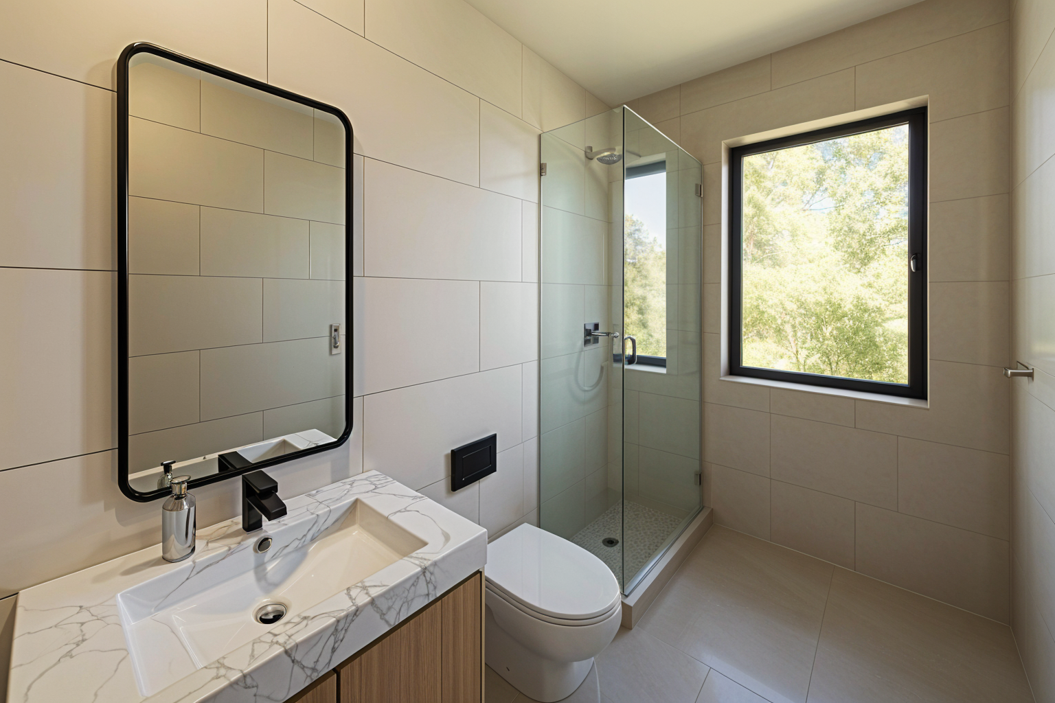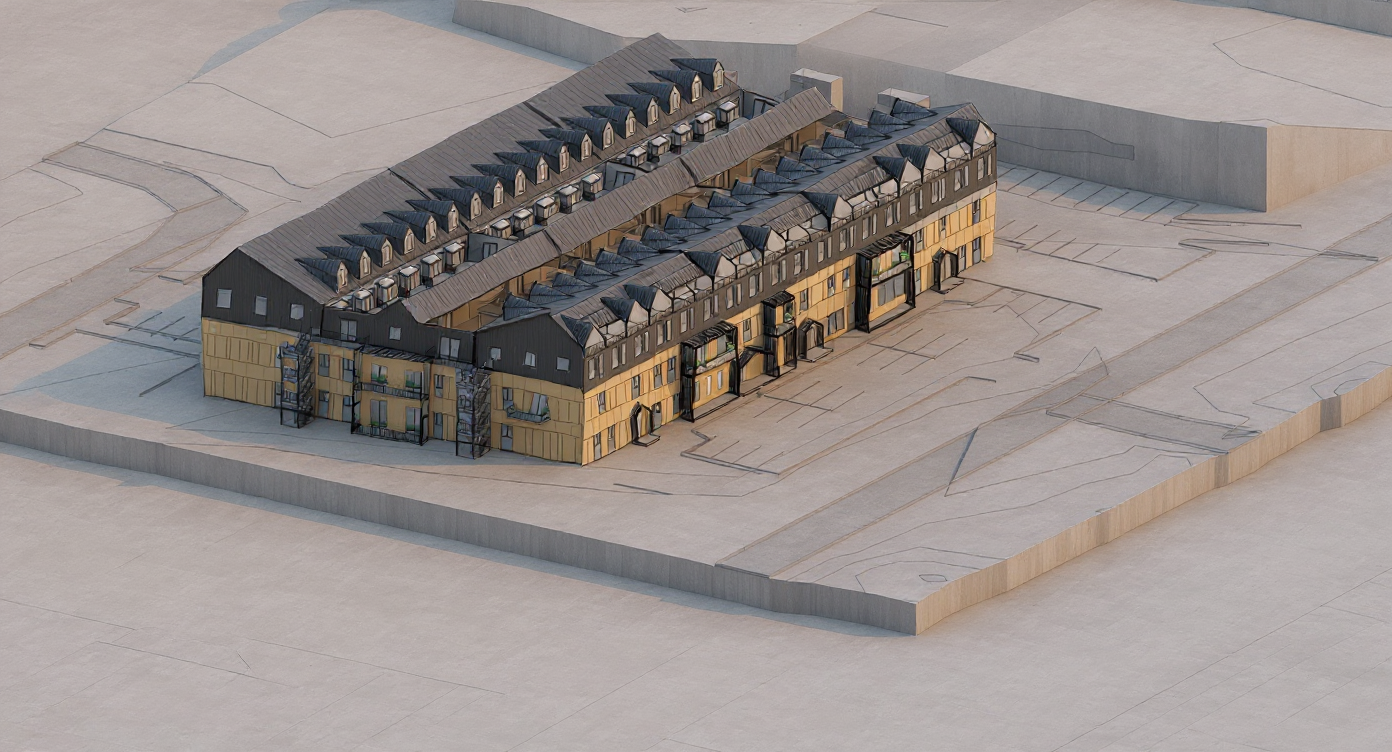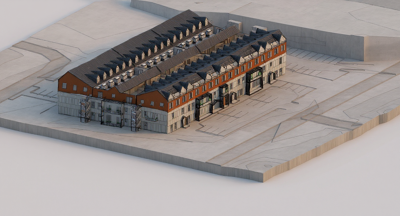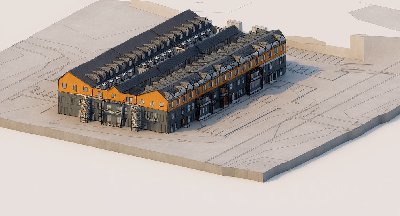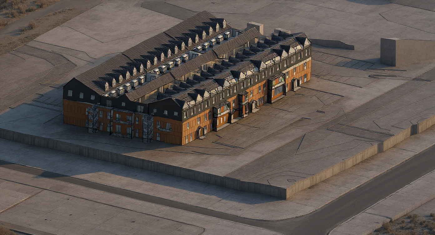 enhance the scene with have photorealistic materials and keeping the original colors the atmosphere should be serene and inviting with a bright blue sky filled with soft fluffy clouds add low lying landscape native shrubs in green areas