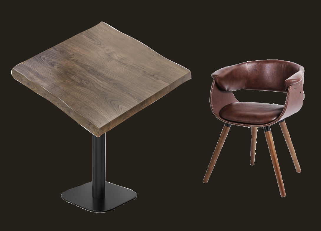 prompt create an ultra photorealistic image focused on a dining table and chair set for a rustic industrial restaurant table sice 60x60cm with tree edge its important to see the edge the table and chair must be the main subject centered and clearly visible in the foreground with high detail on materials textures and craftsmanship style rustic industrial natural wood slightly darker neutral tones not yellowish combined with metal elements black or dark steel the chair should match the table and reflect a strong durable yet stylish restaurant look the environment should be minimal and not distracting only a simple wall in the background red brick wood or subtle industrial texture no additional furniture or decoration or windows lighting should be soft and natural creating realistic shadows and highlighting the textures of wood and metal the image should look like a real professional interior photo not a rendering slightly imperfect with natural light behavior and realistic material details