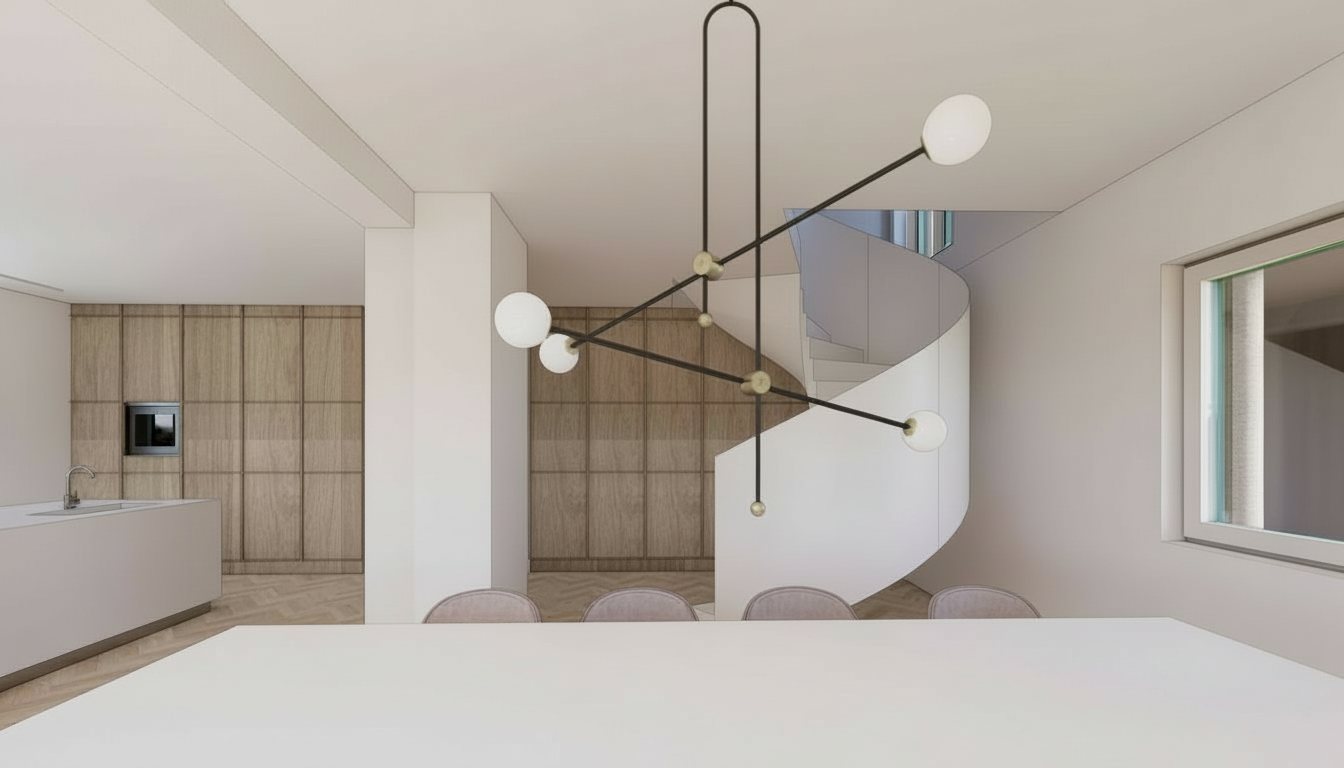 use the provided image as the base do not change architecture geometry layout objects materials colors or camera position plain construction joints no lighting features at transitions photorealism refinement critical improve overall photorealism without changing the design focus on natural material variation subtle surface imperfections realistic light behavior photographic depth light behavior light must behave like real daylight soft gradients gentle falloff no uniform brightness no flat illumination avoid overexposed whites perfectly even lighting artificial contrast material realism all materials wood metal plaster stone should show micro variation subtle irregularities realistic reflectance non perfect edges no material should appear flat plastic overly clean textureless camera image quality the image should feel like a real interior photograph taken with a high quality camera natural exposure slight depth and softness no rendering look no stylization preserve composition design intent and atmosphere exactly