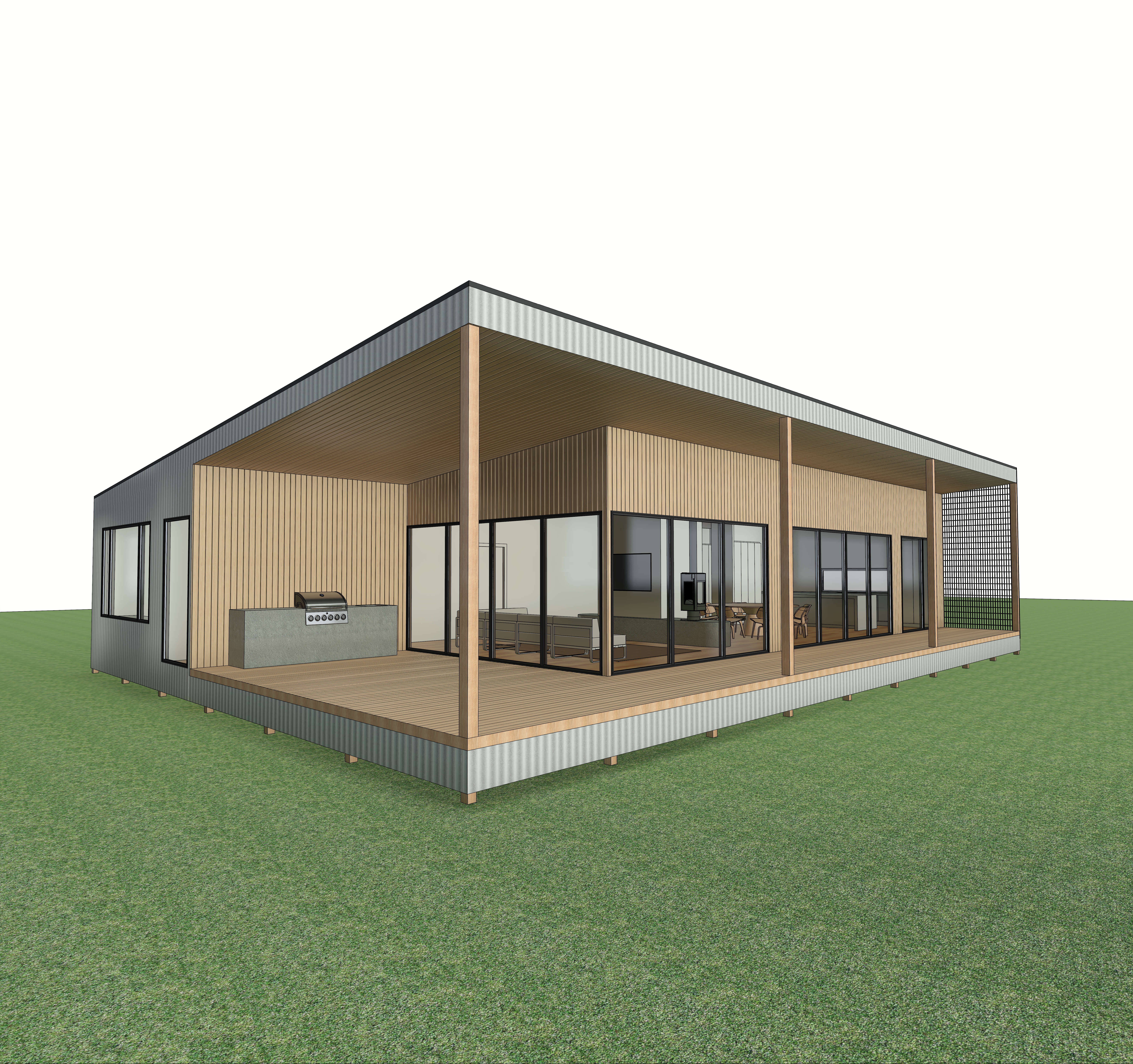 modern cabin with 5 roof line raising towards the right zincalume corrugated metal cladding warm grain contrast timber and large black window frames located in remote bushland with medium size trees and shrubs surrounding background and left and right of frame located in australia morning sunlight