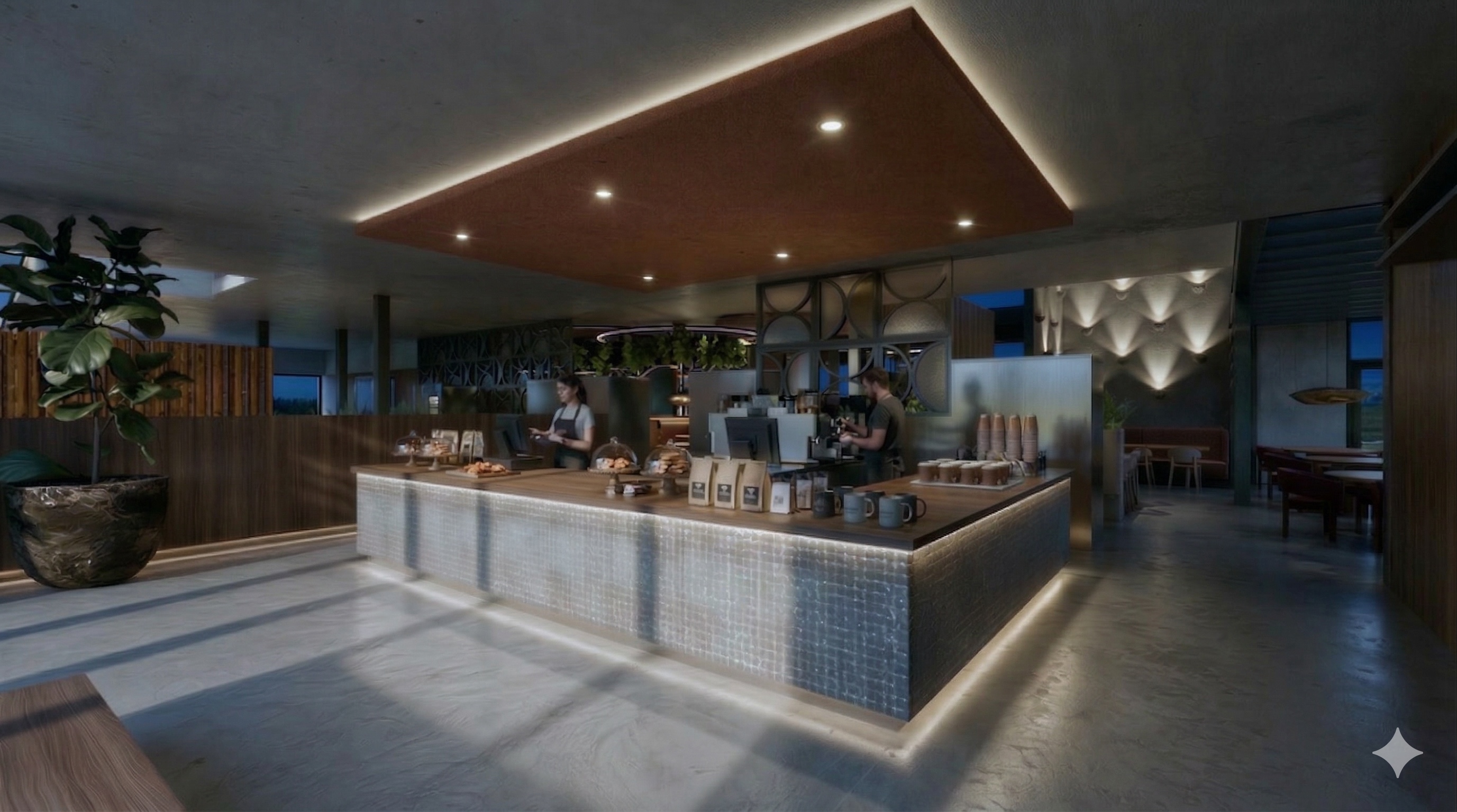 hyper realistic architectural photography high end interior design soft natural sunlight streaming through windows long soft shadows subtle ambient artificial lighting dimmable warm led accents realistic textures 8k resolution highly detailed shot on phase one xf global illumination raytraced reflections clean minimalist aesthetic lock all previous settings subject replace the lady behind the cash register with a blonde european lady