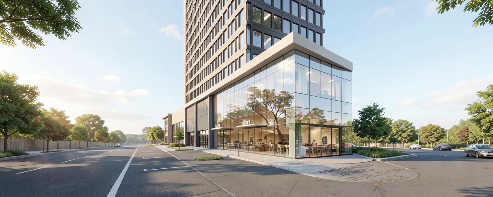all windows have 6 glass panels from the second floor till the last floor keep it consistant on every window and make the picture in day time so it is not that yellow and no neighbors they are all black frames windows doors and rails