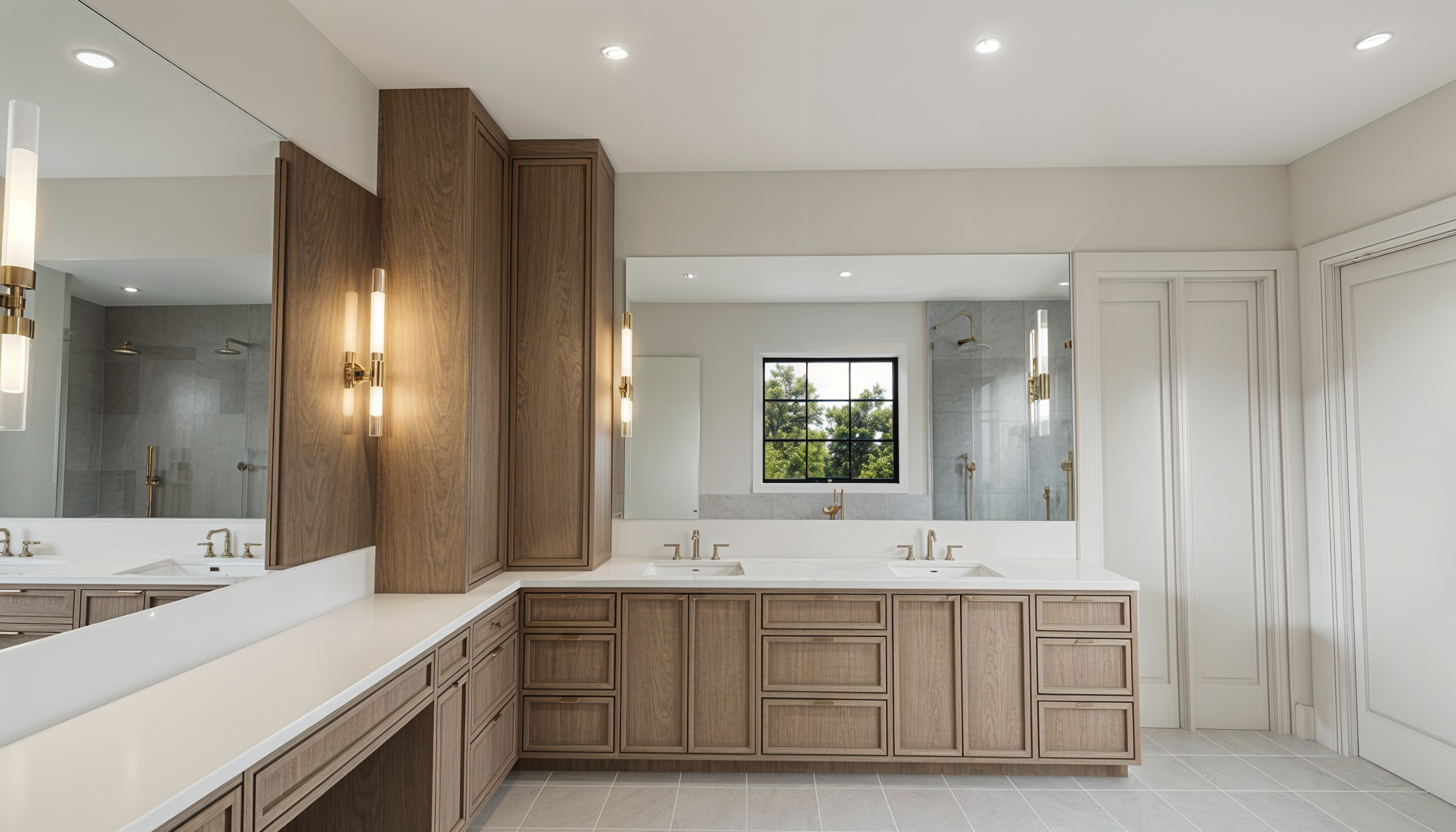 archsynth vanity staging enhancement enhance this image so the vanity appears professionally staged for a luxury real estate listing while maintaining the exact architecture layout materials fixtures and design already present do not change the cabinetry countertops mirrors lighting fixtures plumbing fixtures tile or wall finishes only add very minimal staging accessories add subtle restoration hardware style vanity styling that feels refined neutral and upscale on the vanity counters add only a small number of curated accessories such as one simple neutral soap dispenser one small tray with a folded neutral hand towel one small elegant container or dish appropriate for a luxury bathroom accessories should appear minimal balanced and intentionally placed with plenty of open counter space remaining the styling should feel similar to a luxury hotel or restoration hardware display understated and refined do not add excessive decor baskets plants or multiple stacked towels avoid clutter the goal is to make the space appear subtly staged luxurious and editorial while allowing the architecture and materials to remain the primary focus maintain the same soft natural lighting and editorial architectural digest photography style already established in the image