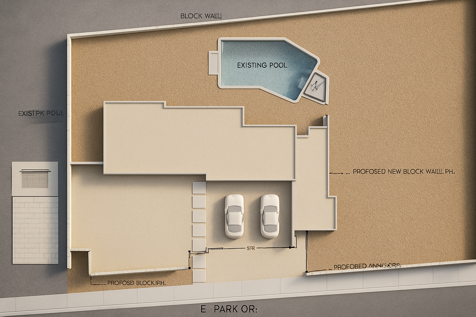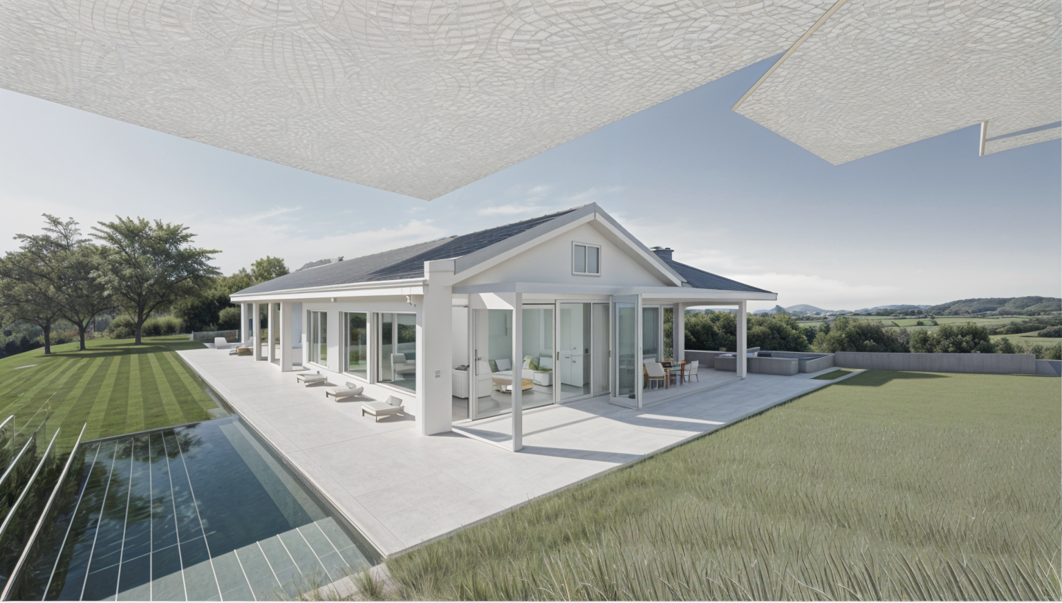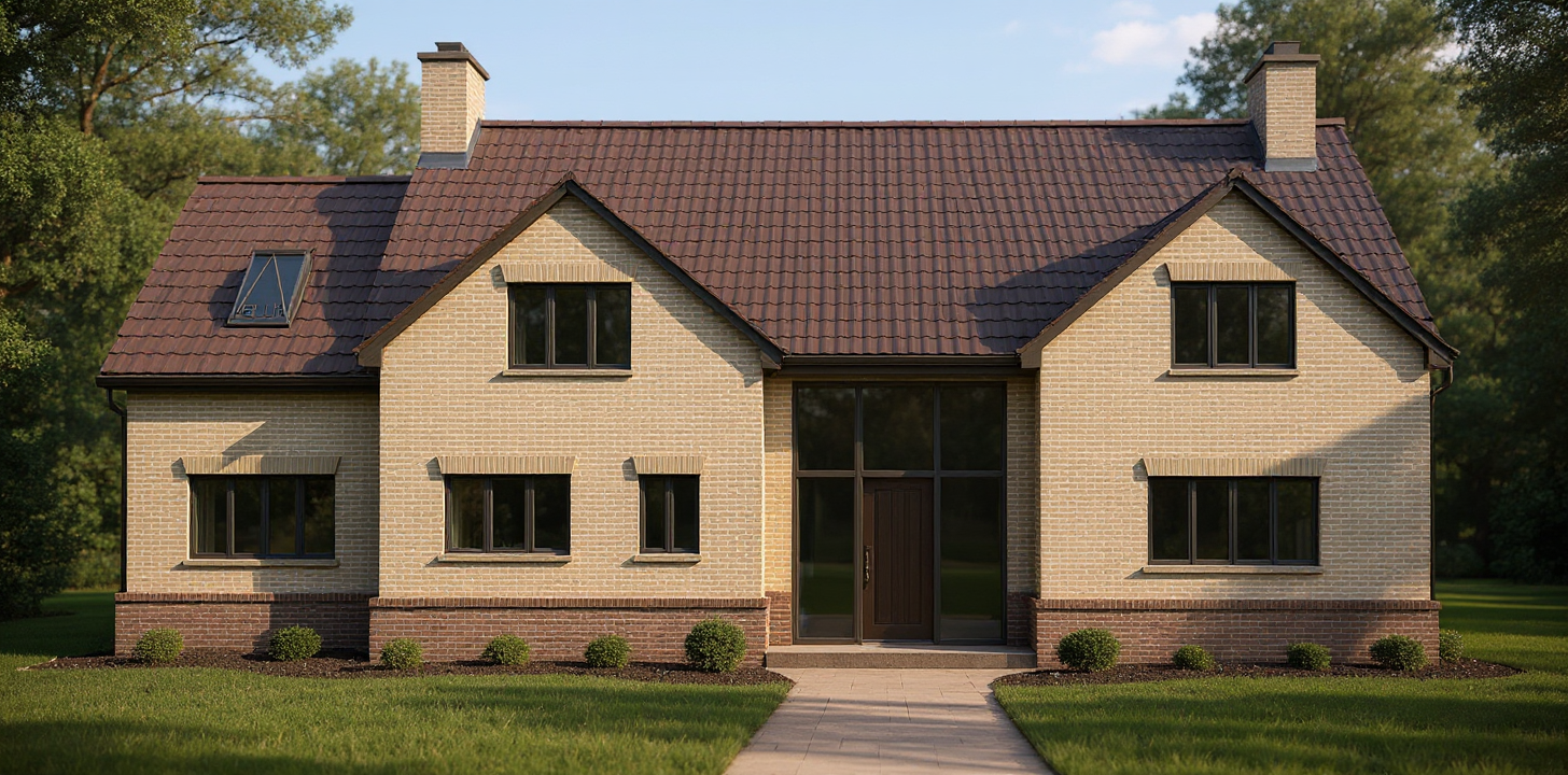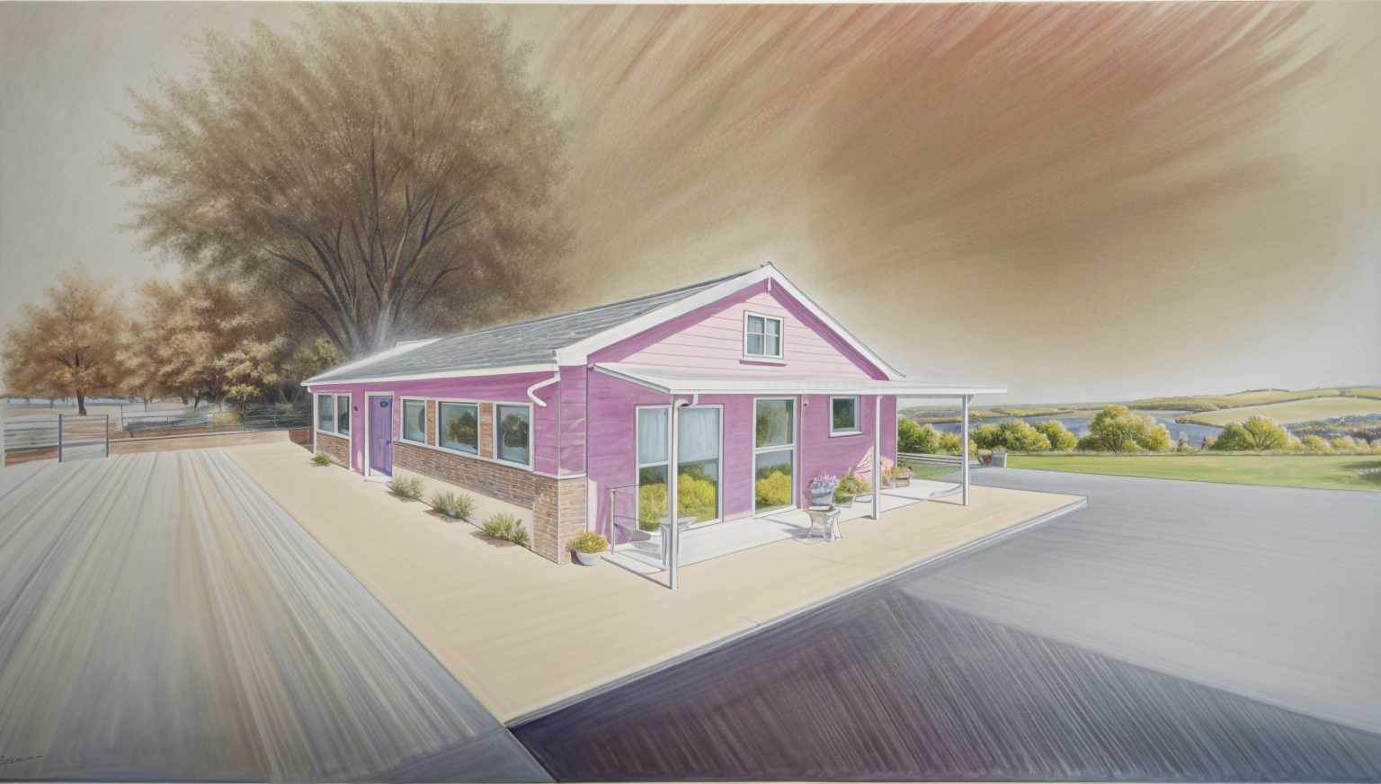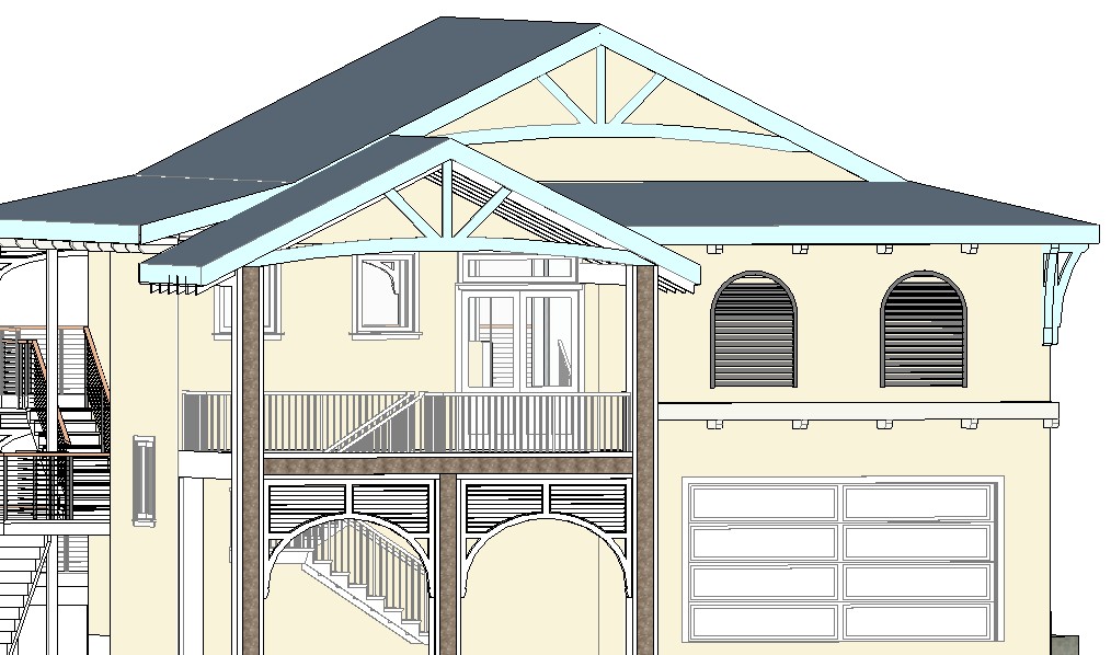 the walls are pale yellow the roof is pale teal the trim is white the louvered windows over the garage are to be depicted as louvers only the columns on the front porch have a stone facade with white borders the setting is tropical with coconut palms nearby