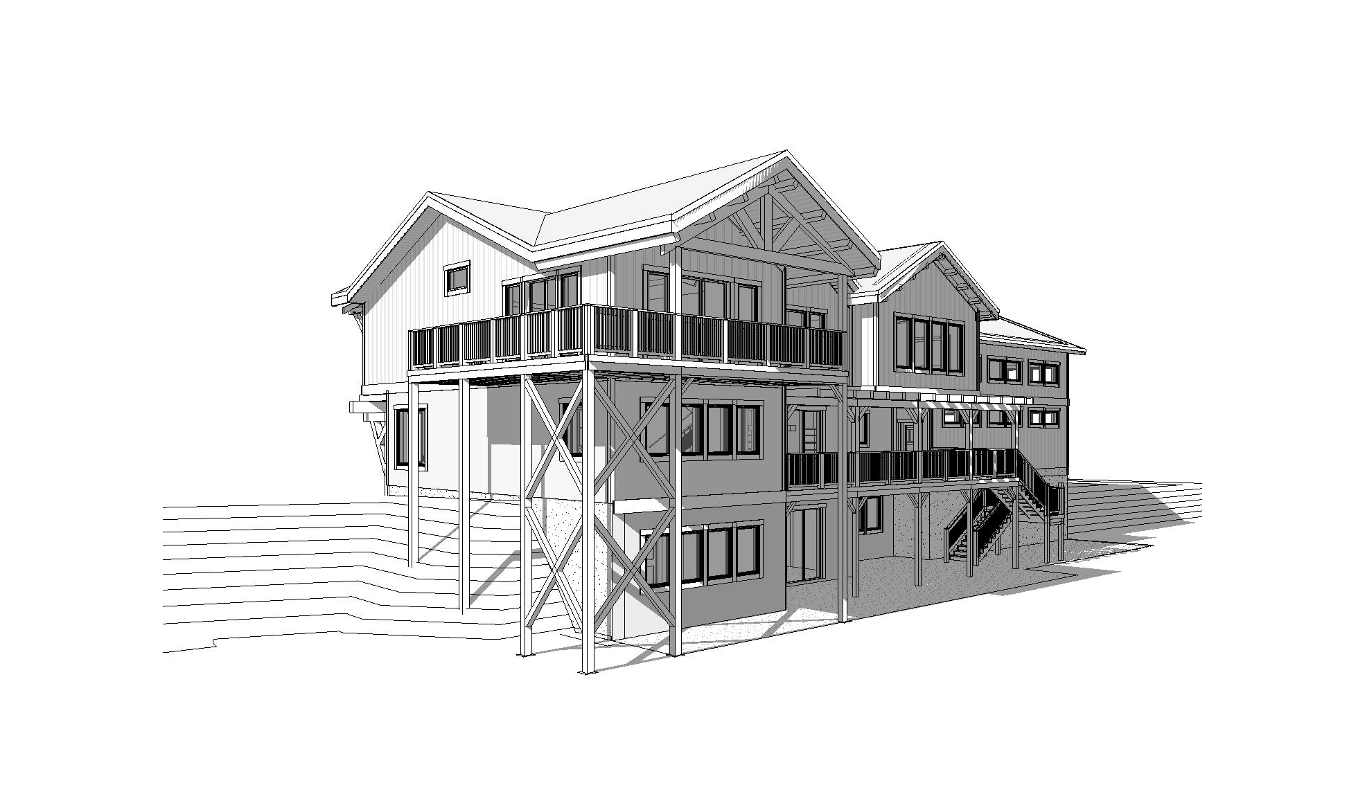 rear view of a clean modern modern architectural exterior rendered in cinematic vibrant golden hour lighting with vibrant colorful skies heavy timber architectural style vertical select grade cedar siding manicured landscaping around structure with hedges black standing seam metal roof prominent cinematic big douglas fir trees surrounding the house and big mountains in the far distance in the background this house is on a sloped bank thats above a valley below it in the foreground high fidelity photorealistic visualization crisp shadow falloff refined facade geometry soft atmospheric depth premium architectural photography mood ultra clean composition and materials black window trim dark roof trim photorealistic render