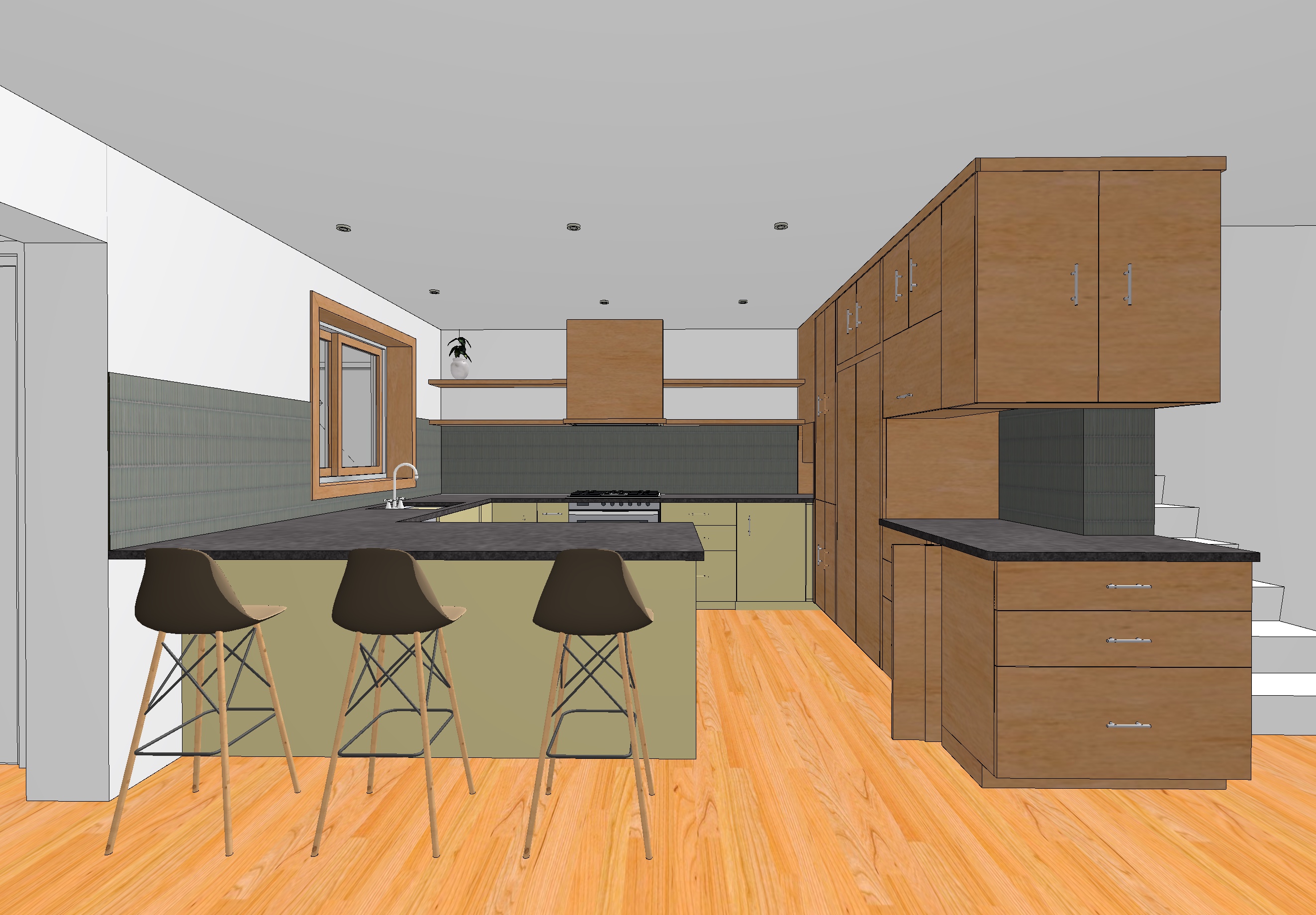 change all the blue backsplash tile to skinny yellow tiles that compliment the colors of the space and give it a mid century modern feel