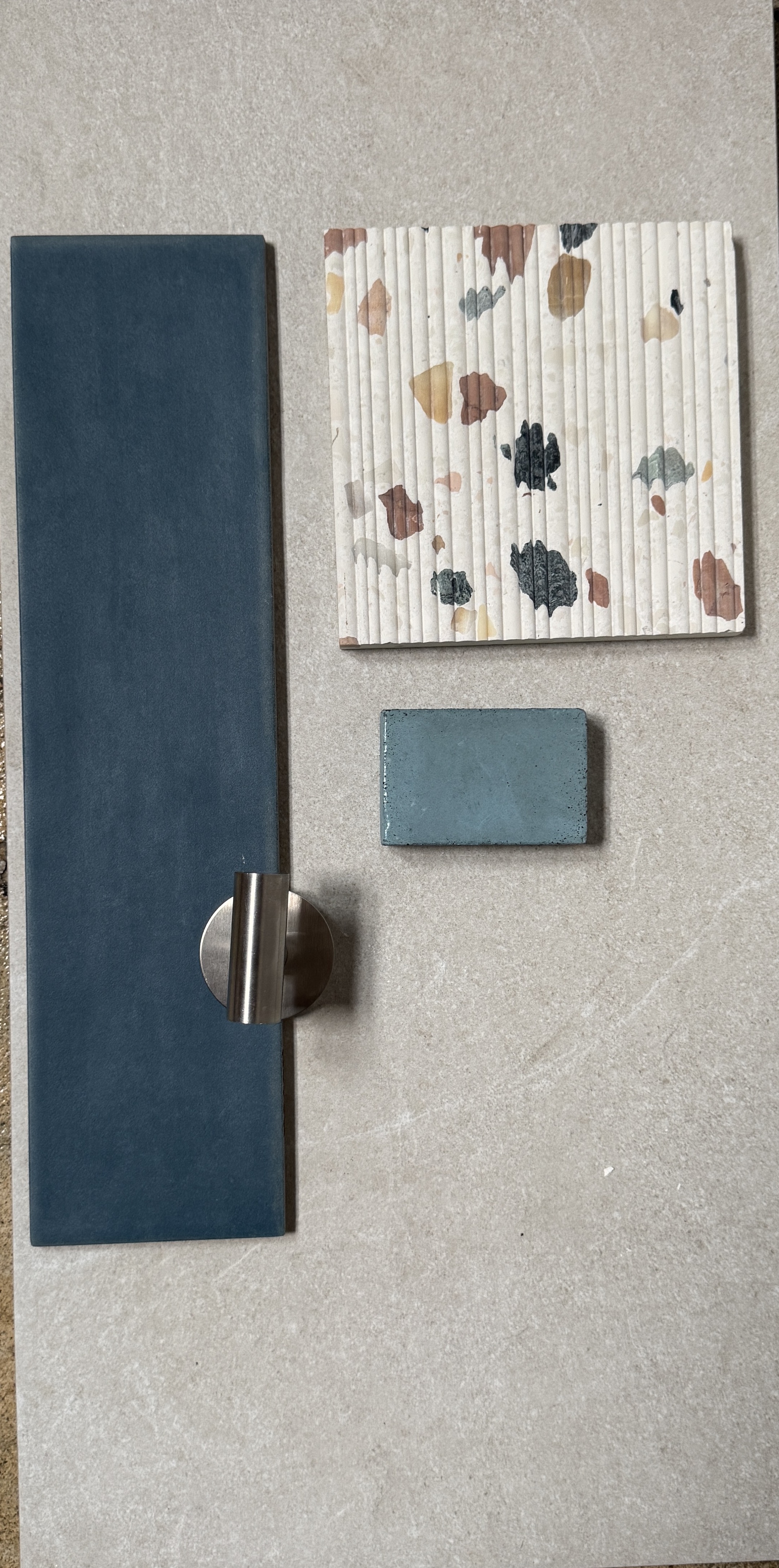 exterior shot dark blue wall tiles behind the toilet terrazzo tiles behind the vanity sink light blue concrete vessel sinks light oak wood vanity natural stone floor tiles