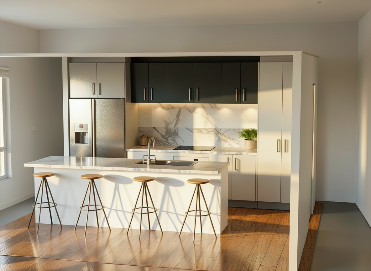 contemporary exterior shot 4 story modern apartment building made of red and brown brick with black metal accents large rectangular windows lush green trees and plants surrounding spacious parking lot in the foreground bright blue sky with soft clouds warm and inviting atmosphere incorporating realistic lighting and shadows architecture