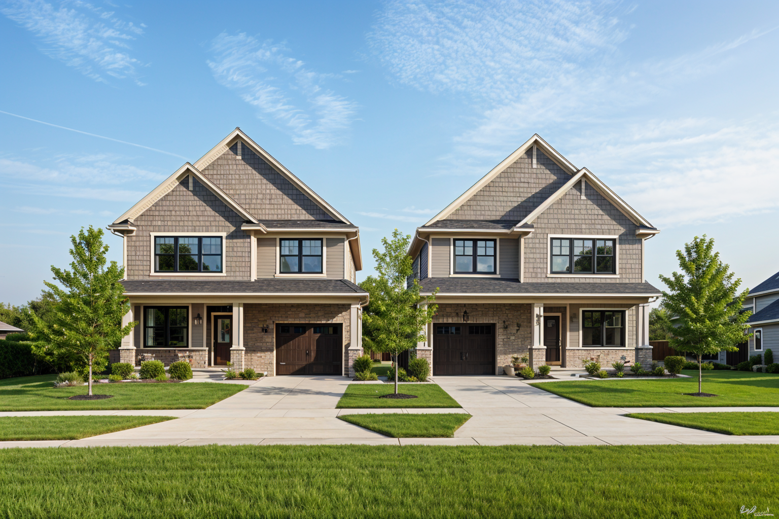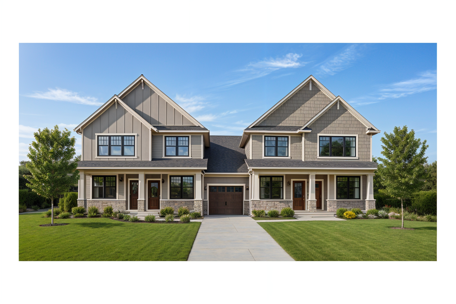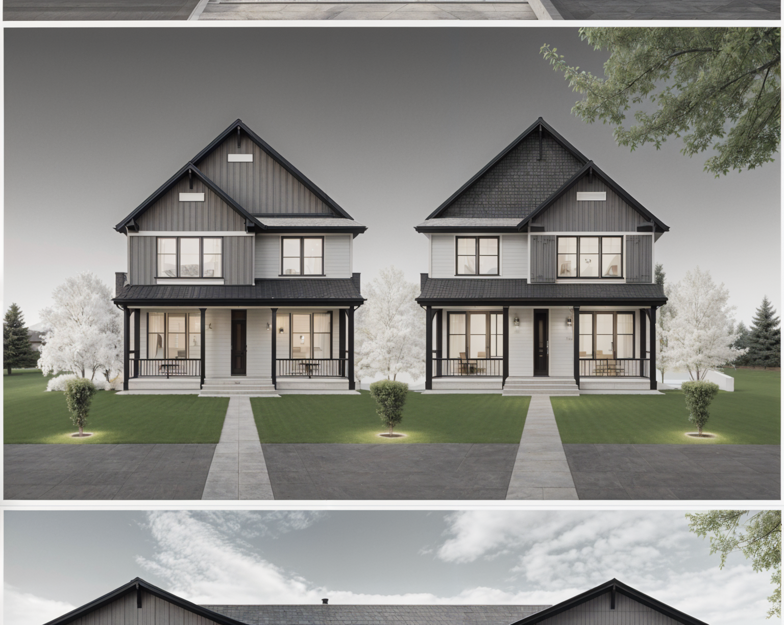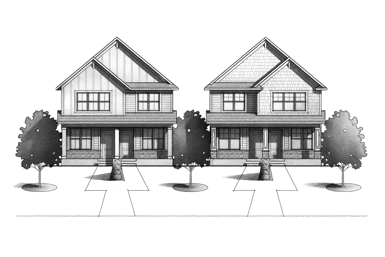 convert this black and white 2d architectural elevation drawings into a photorealistic rendering of two modern craftsman style homes apply exterior finishes and colors to match the reference house muted green shingle siding light stone accents on the lower portion cream colored trim and black framed windows and doors both homes to have slightly varying colors use a dark charcoal roof with dimensional shingles add a clean concrete driveway leading to dark gray garage doors with simple rectangular windows include a fresh green lawn small landscaped shrubs with rock edging and one young tree in the yard ensure realistic textures natural daylight and a bright blue sky with light clouds similar to the reference photo