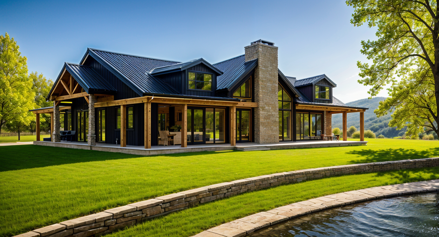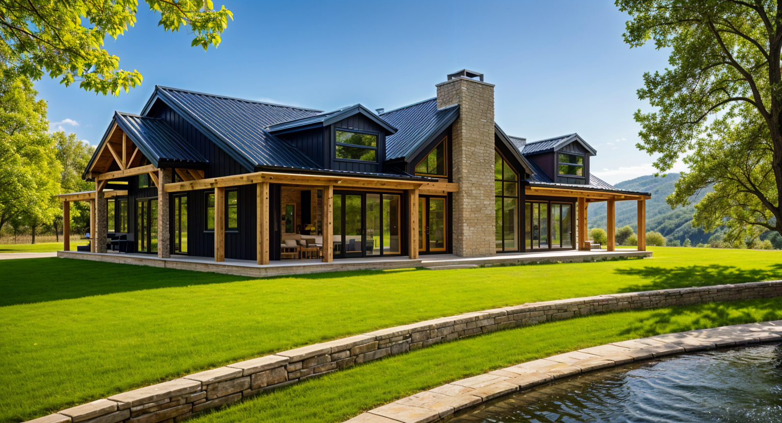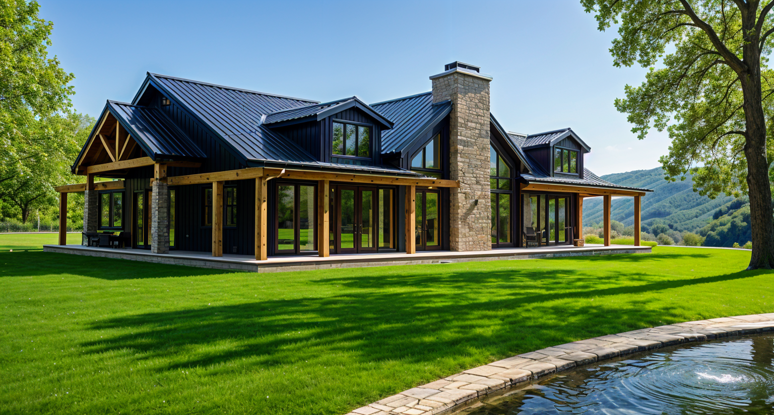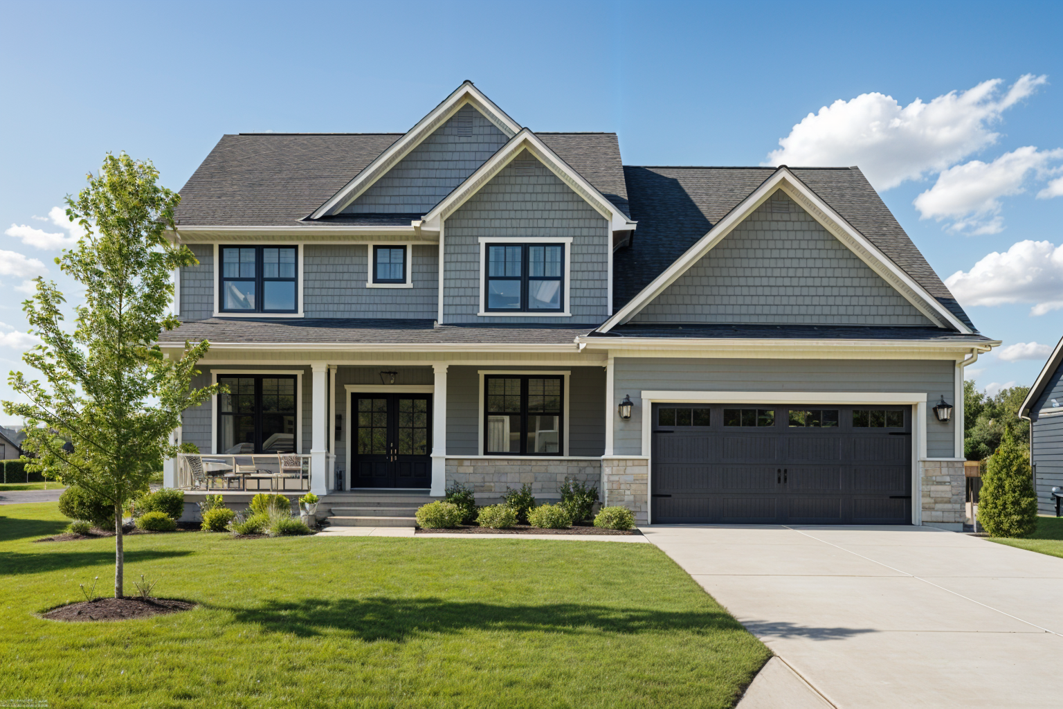 convert this black and white 2d architectural elevation drawings into a photorealistic rendering of two modern craftsman style homes apply exterior finishes and colors to match the reference house muted green shingle siding light stone accents on the lower portion cream colored trim and black framed windows and doors both homes to have slightly varying colors use a dark charcoal roof with dimensional shingles add a clean concrete driveway leading to dark gray garage doors with simple rectangular windows include a fresh green lawn small landscaped shrubs with rock edging and one young tree in the yard ensure realistic textures natural daylight and a bright blue sky with light clouds similar to the reference photo