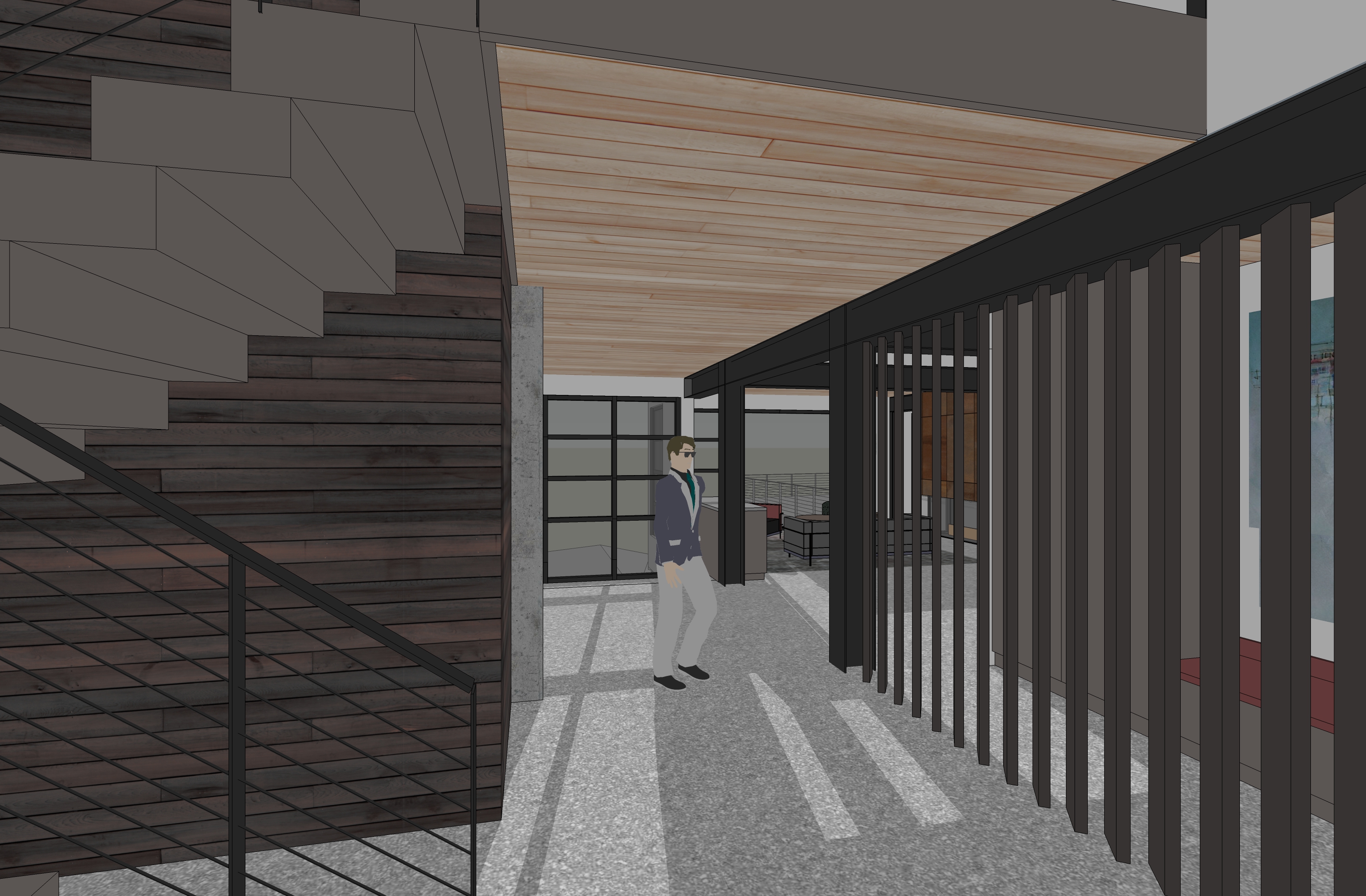 interior view matte concrete floors wood ceiling matte black steel framing matte wood cabinetry corten steel fireplace color furniture