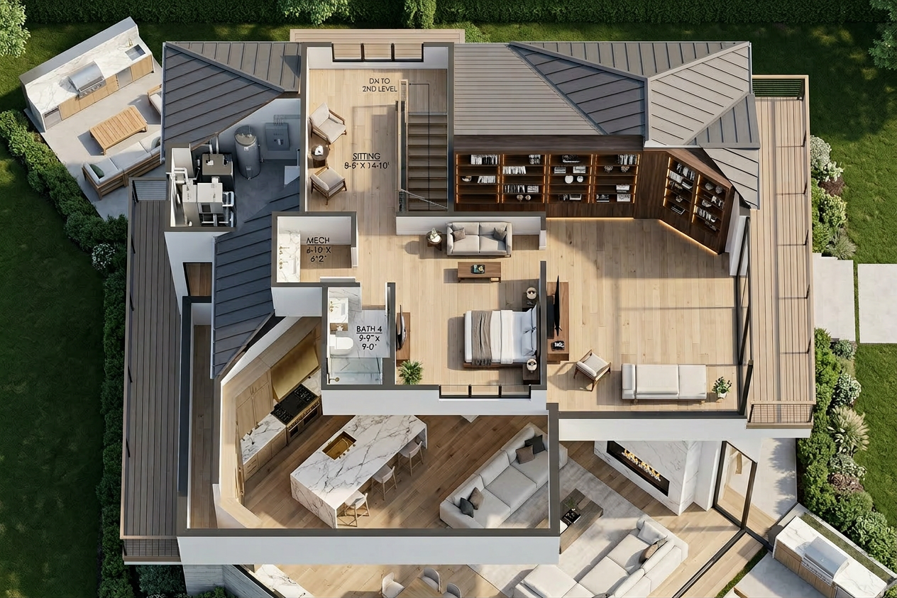 keep everything the same unless i say otherwise add a plant wall around the big a sign on the back wall carve out a square shape for the a to still show and the lettering under it to show too make the a sign colors more solid btu keep the same colors make the letter underneath white and illuminated advertising as the small word under the word abstract keep on the fonts sizes the same cut the plant wall off before the window window frames to be matte black view outsid ethe windows as the kansas city street landscape viewed from the second floor persepctive tun all the lights on the two pendants above the couch and the track lights too add a computer on the coffee table in the middle as if to women are there conversing about whats on it both womenn are professionally dressed one sitting on the chair in the back and one sitting on the back corner of the sofa laughing enjoying their time leave everything the same as in the original photo
