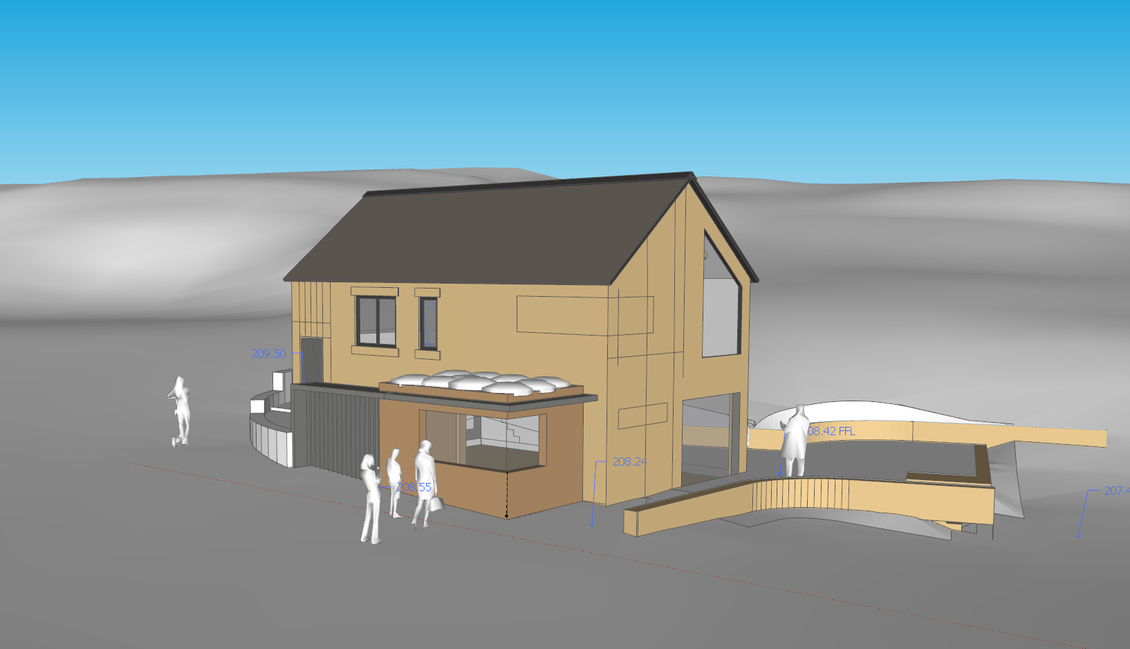 render the building as slate roof stone walls wood clad ground to be stone cobbles add trees and sky to backdrop
