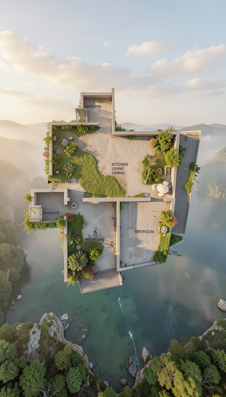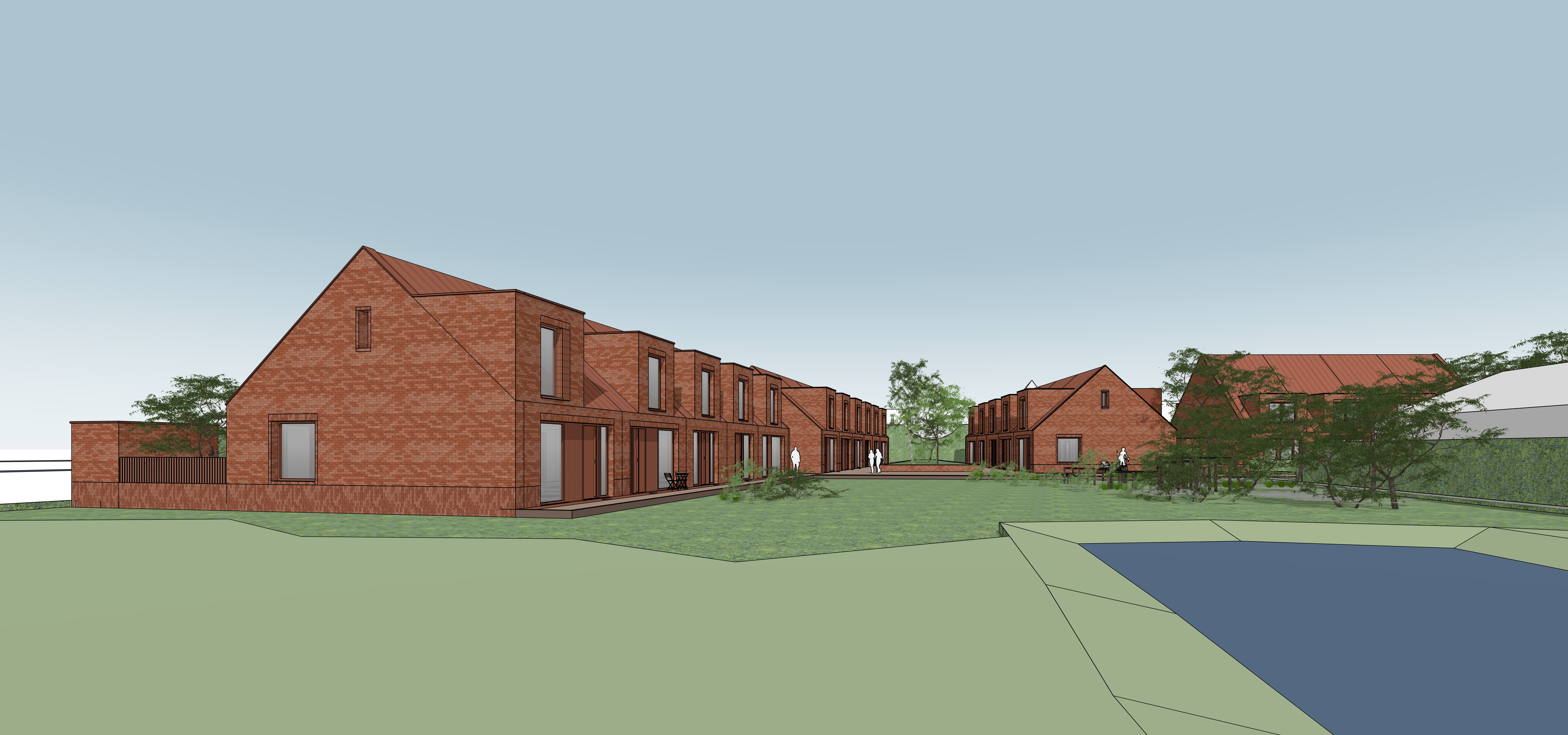 a calm and inviting courtyard composed of contemporary brick buildings with pitched roofs and simple refined geometries the roofs are clad in red brown vertical panels with a matte weathered finish the fa ades are made from red brown brick with a more uniform less variegated tone the window and door frames are slightly redder in color creating a warm contrast with the masonry the sides of the dormers are constructed in matching brick integrating them seamlessly with the fa ades the paved courtyard surface is replaced by a natural meadow landscape characterized by tall grasses low herbaceous plants and open patches that create an inviting habitat for meadow birds the ground feels soft wild and ecologically rich blending gently with the surrounding architecture a small courtyard tree with warm toned foliage adds seasonal color soft diffused daylight under an overcast sky creates a serene and balanced atmosphere a few people are casually present enhancing the quiet sense of community the overall mood is peaceful natural and subtly rustic with photorealistic materials high end architectural visualization quality and a composition that highlights ecological softness and harmonious outdoor living
