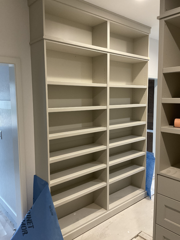do not change the cabinets in any way preserve the exact cabinet colors materials finishes dimensions door and drawer styles hardware spacing alignment and all geometry exactly as shown do not alter the countertop shape backsplash appliances flooring lighting fixtures or wall structure only remove the construction materials clutter and mess from the scene clean the room and make it look finished and staged add a few simple tasteful home accessories appropriate for the style of the space but do not add or remove any furniture windows or architectural elements maintain the original lighting direction and realism enhance clarity and polish the photo while keeping the cabinetry and room design completely unchanged do not alter the lighting to keep the cabinet colors as they are in the image add carpet add brushed nickel cabinet pulls to the door and drawer fronts stage for a luxurious closet do not change or expand the photo at all keep the angle as is do not change the cabinets at all keep all the open cubbies as is and do not add doors