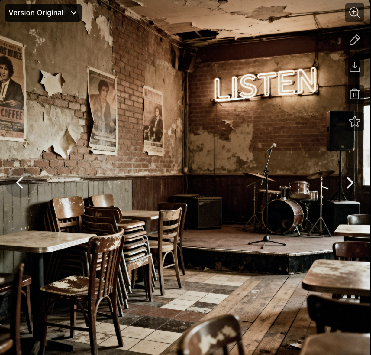create a rundown 1960 s coffee house on the back wall there is a door on the left hand side and a musician platform on the right the walls are covered in old ripped and falling down posters there are old mismatched tables and chairs there are stacks of chairs on the back wall there is a neon sign that says listen that is half falling off there is old brick on the back wall on the floor there are layers of old flooring wood tile lino there is a violin guitar cello hammond organ in the space