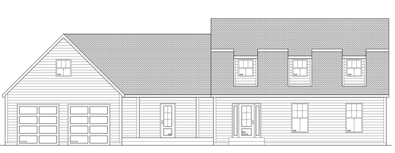 cape cod style home with dark charcoal shingled roof light beige siding white windows with mullions in the top pane only white trim light grey blue painted entry doors white garage doors with a simple shaker panel concrete front steps to two entry doors add a wall light on both sides of both doors