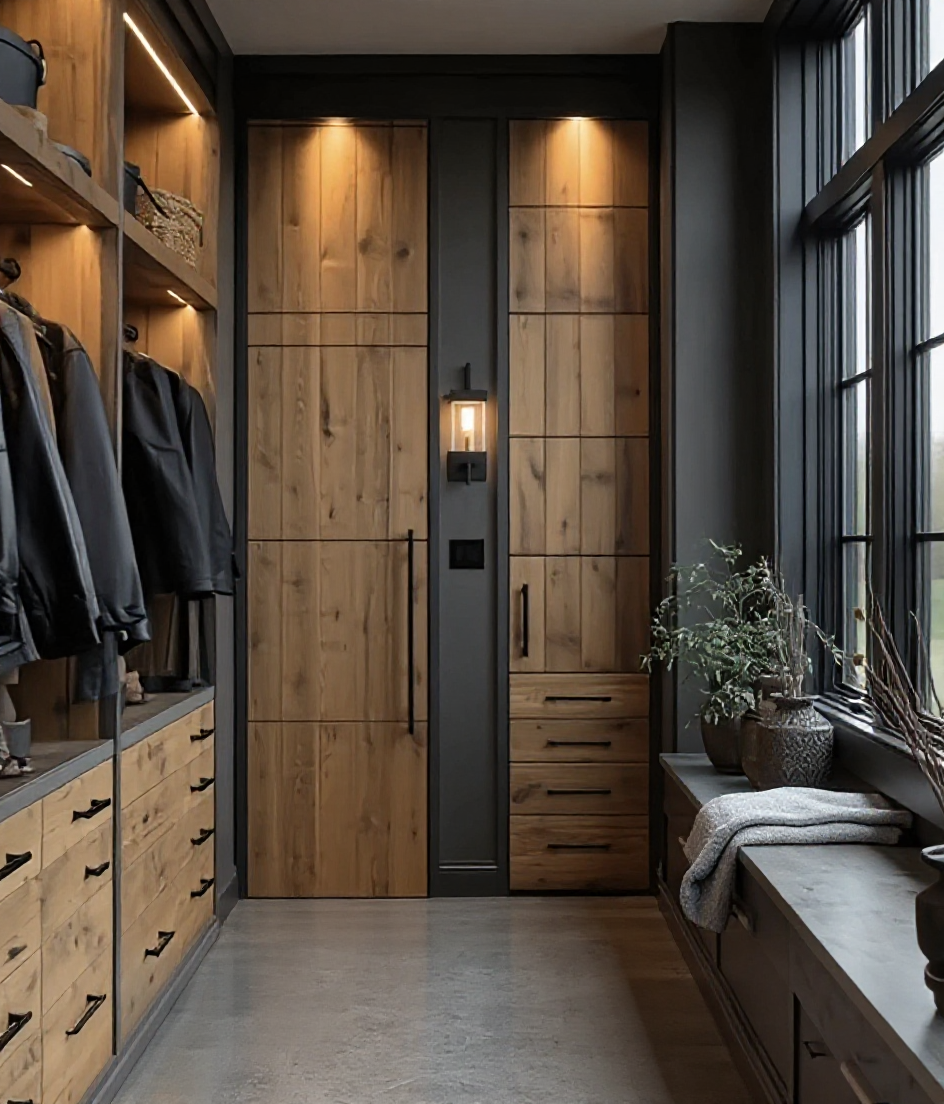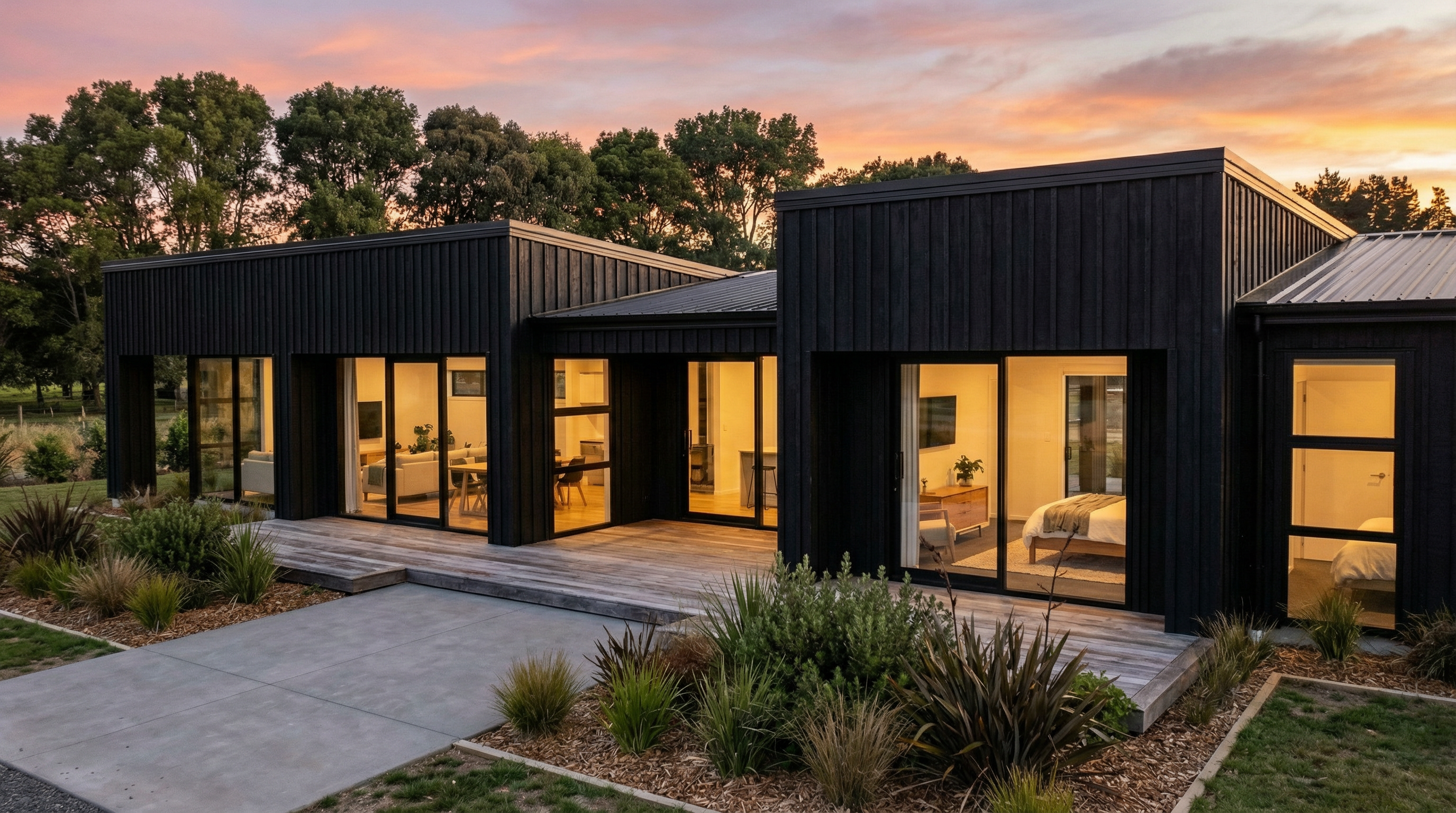keep image perspective black roofing black vertical timber cladding black window frames extensive native planting trees in background low timber deck lawns concrete paving sunset interior lights on