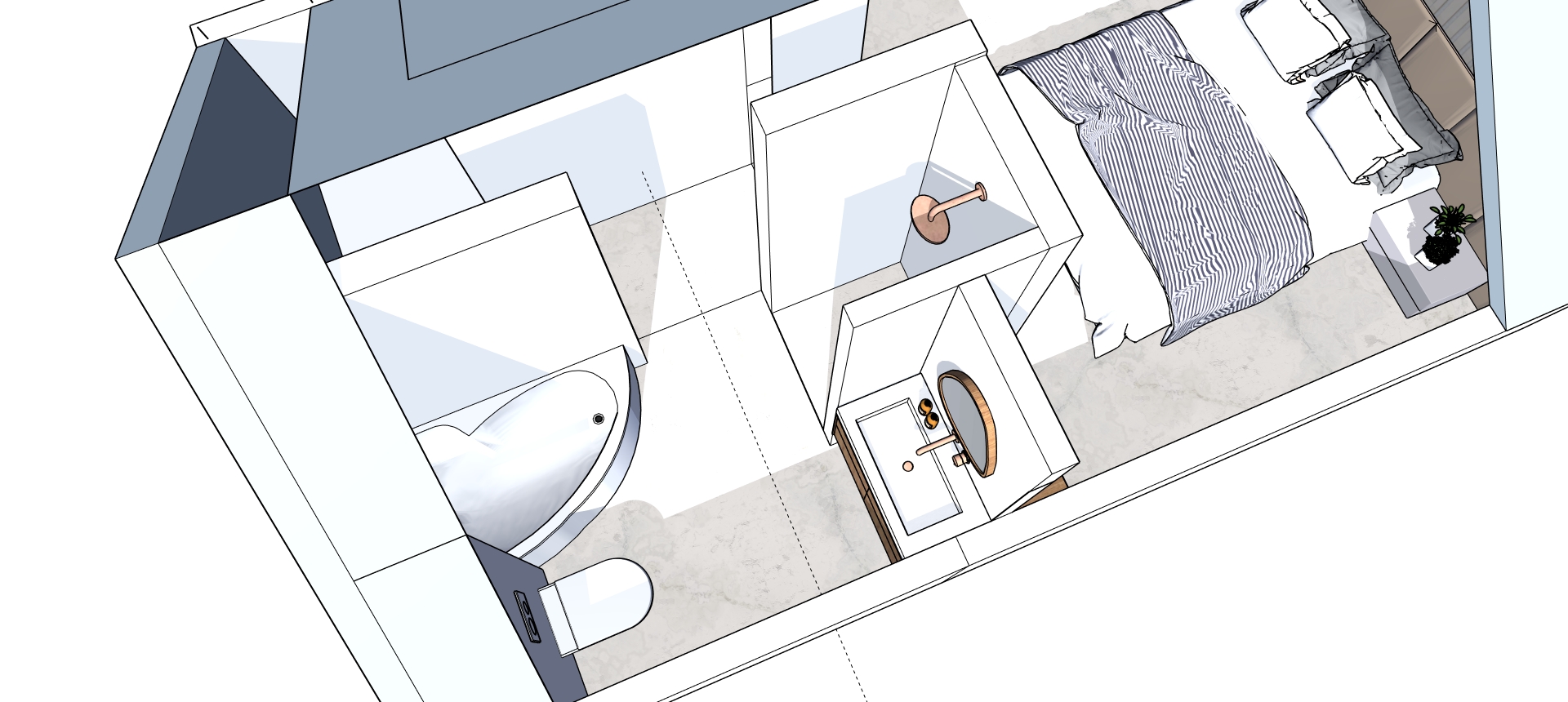 interior from the top use natural materials japandi style bathroom with bath in the corner under the roof a toilet shower and sink close the room with a door