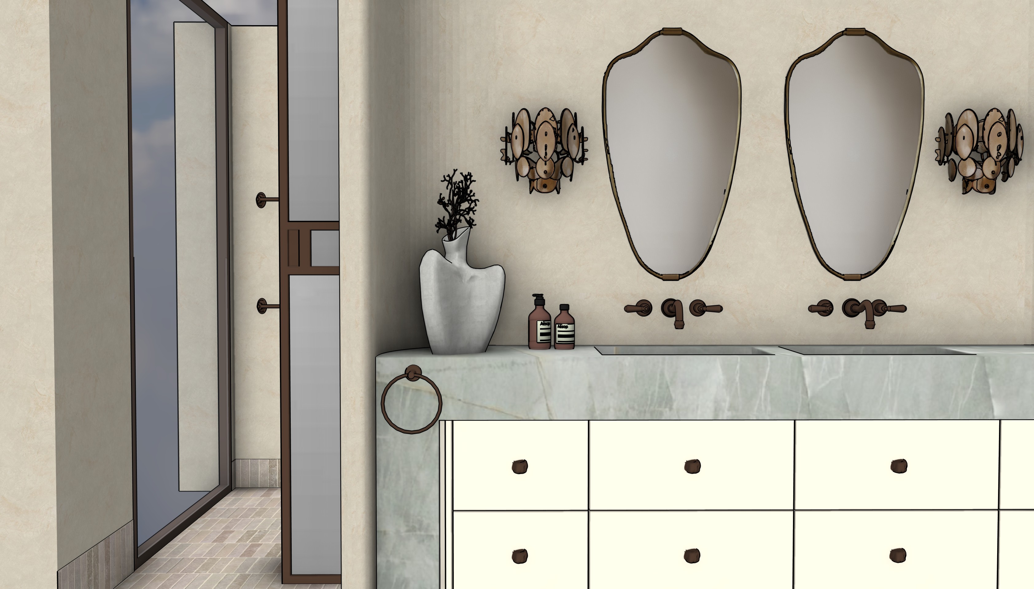 the wall sconces are soft brown toned murano glass the vanity cabinetry is white polyurethane which a reclaimed timber kickboard golden hour dusk time of day the bathroom door is flemished glass with a bronze frame