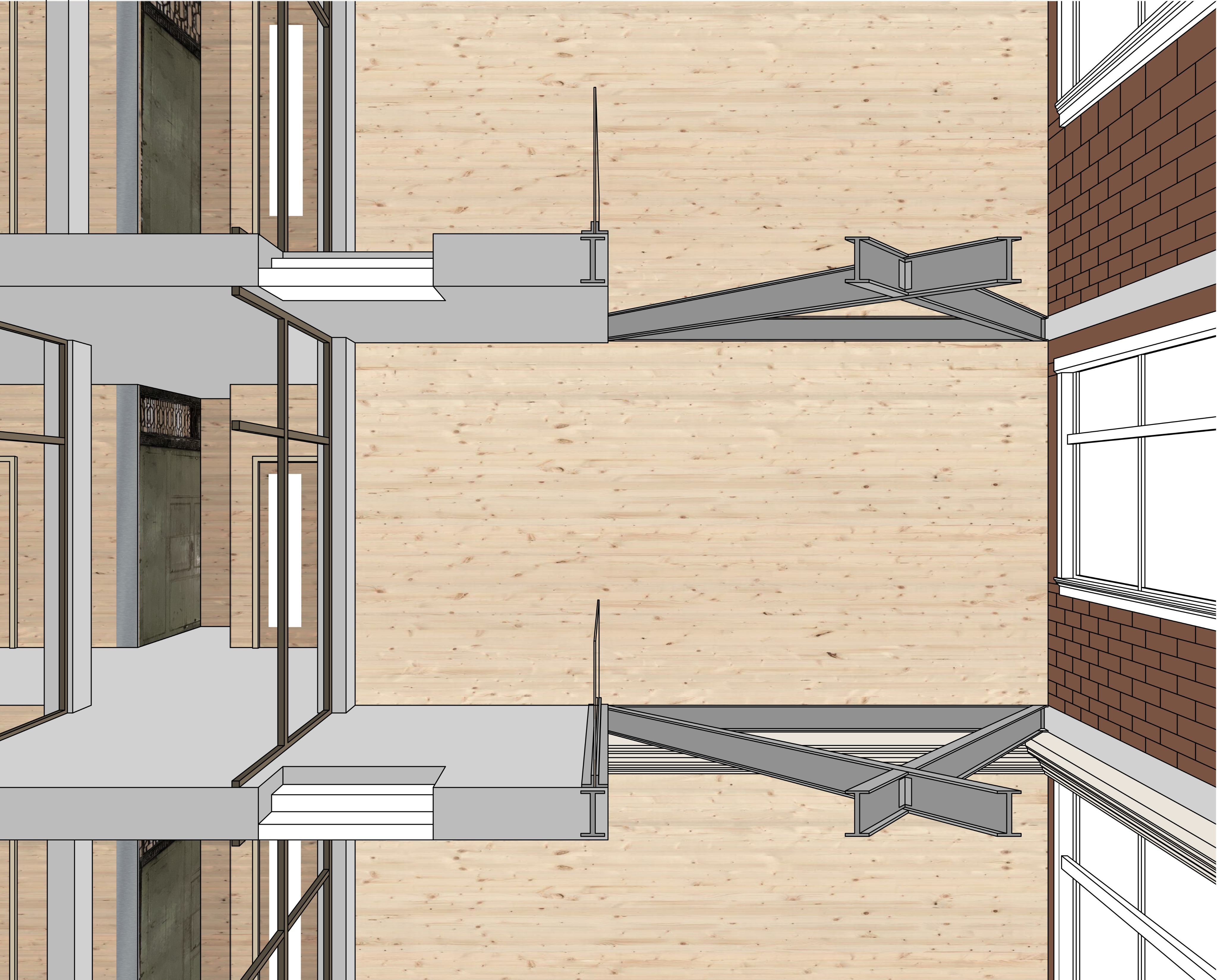 transform this image into a warm contemporary adaptive reuse atrium while preserving the exact section perspective geometry cut plane and proportions of the original drawing maintain all cut elements exactly where they occur and render cut materials accurately show clt wall panels with clear vertical grain at the cut plane exposed brick with crisp cut texture and concrete floor slabs with realistic aggregate at the cut for elements beyond the cut plane render full materiality with photorealistic detail replace interior wall surfaces with exposed brick and clt panels convert all floors to smooth lightly polished concrete do not alter redesign or replace the stair geometry keep the existing stair shape dimensions and layout exactly as drawn preserve the historic trim located under the first set of steel crossing beams exactly as drawn do not remove modify or reinterpret it render the historic trim clean crisp and white maintaining its original profile and proportions maintain all steel beams and connections rendering them with slightly weathered steel texture introduce soft diffuse natural daylight from above and adjacent glazing to match a modern adaptive reuse atrium enhance depth contrast and material realism while keeping all architectural lines structural relationships and section cuts unchanged