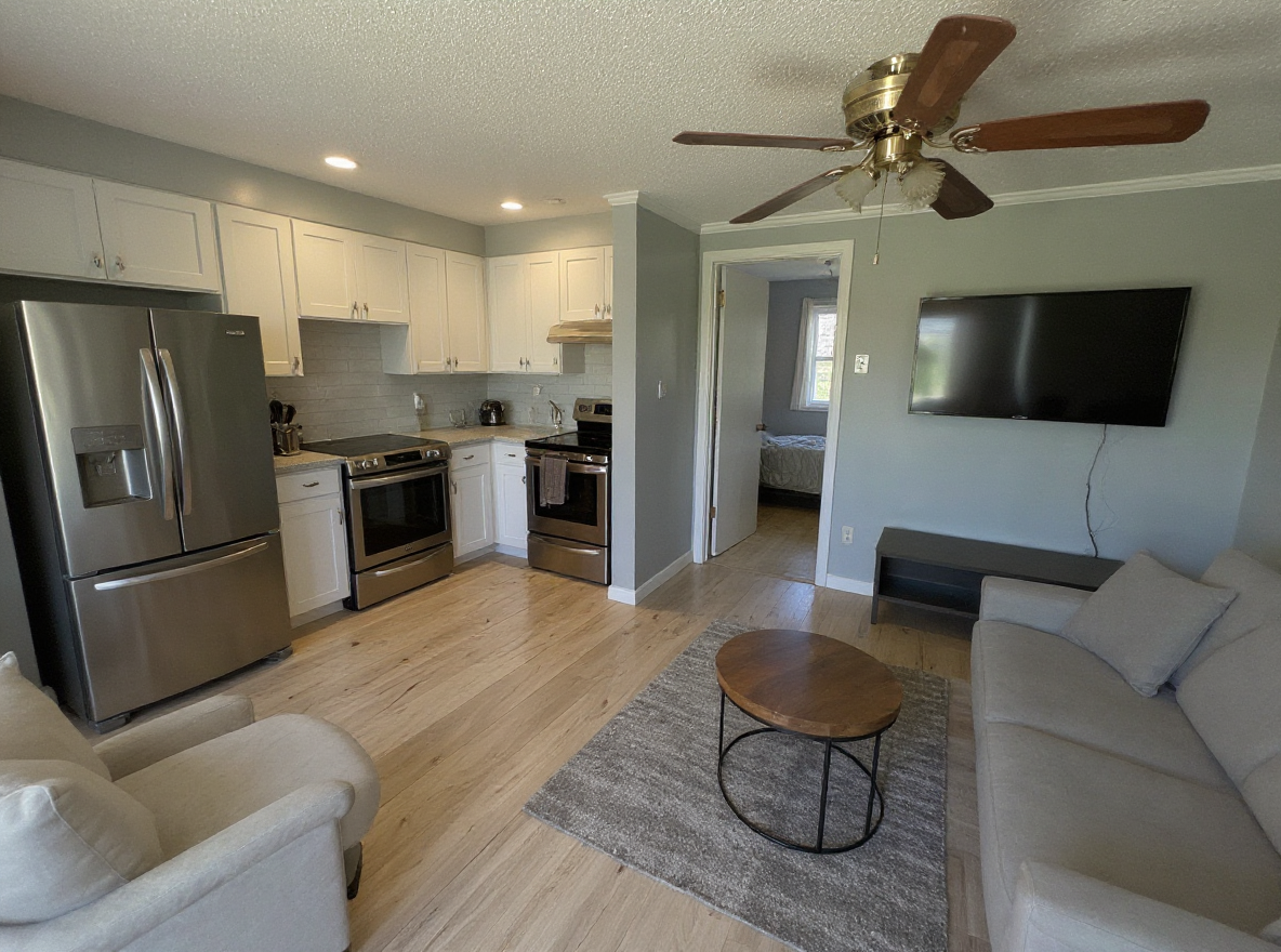 put these white cabinets in a residential home with new floor drywall ceiling natural light put in a new backsplash add a cooktop below the hood and restage the countertops do not add or change the cabinet layout make all of the walls drywall to match the ceiling