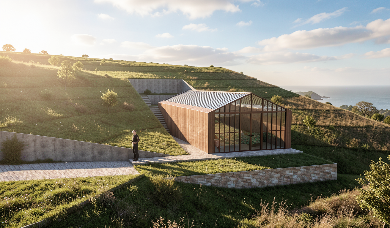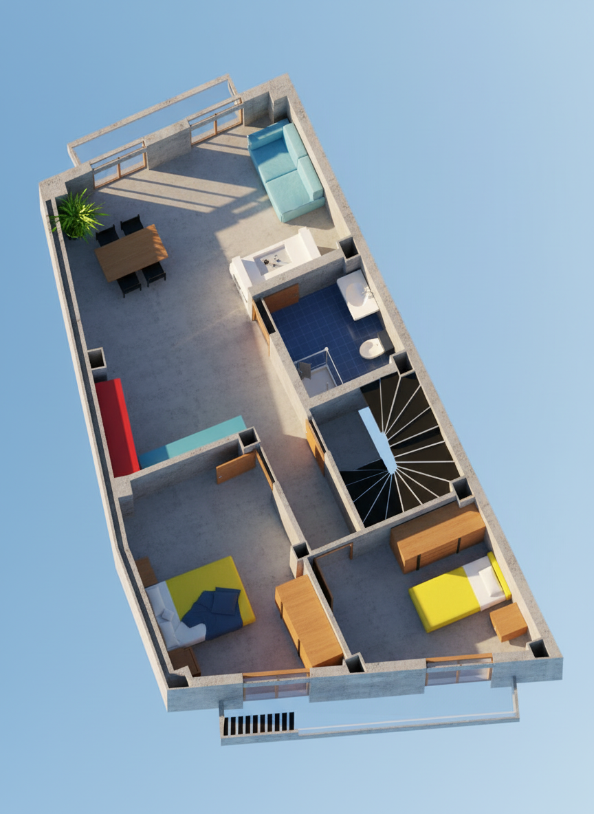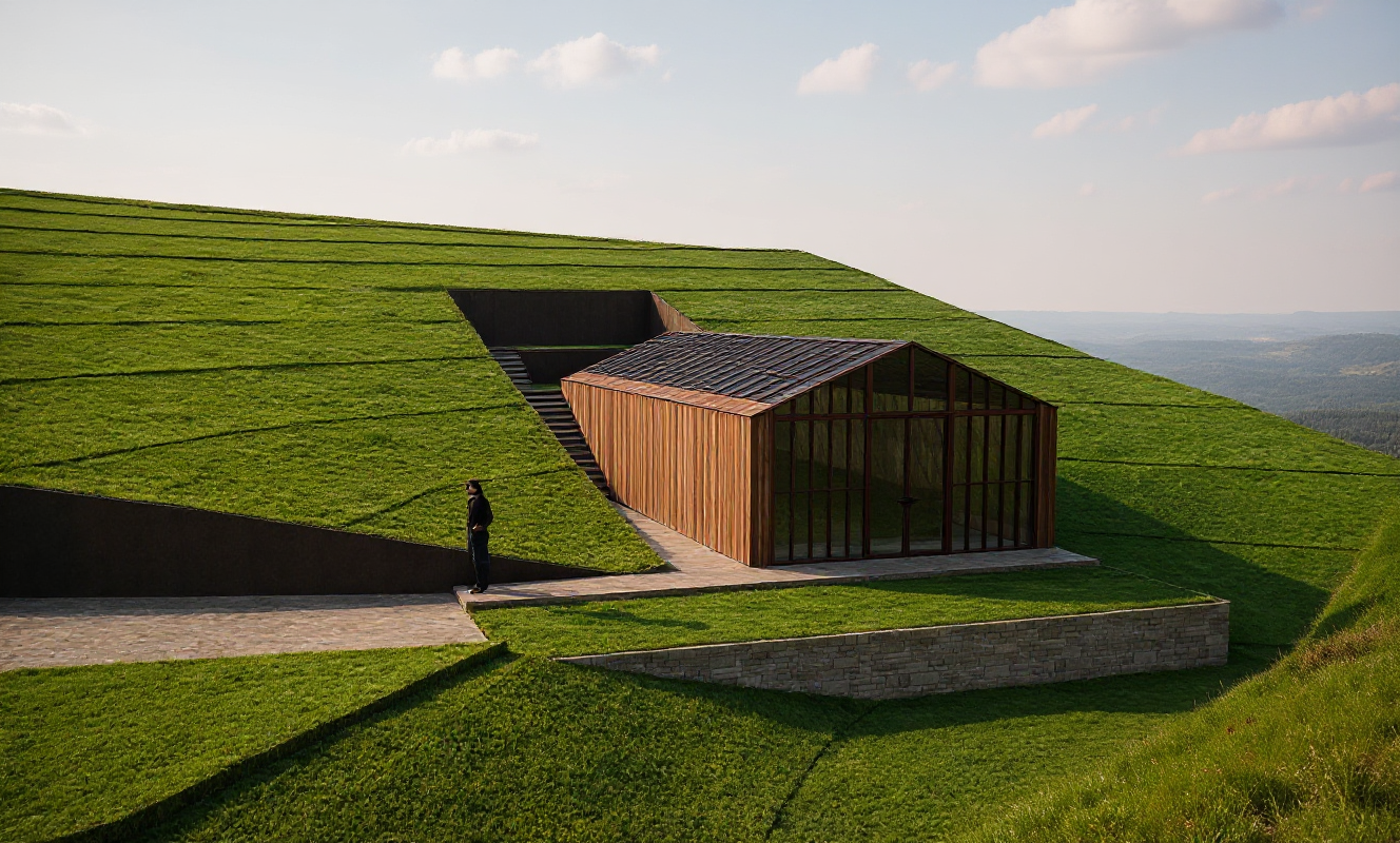 photorealistic architectural interior render of a narrow changing room corridor in a public bathhouse perspective view looking down the length of the hallway the corridor has multiple doors on the left side each with a warm walnut wood frame preserve all existing spatial layout door positions and signage placement exactly as shown in the reference image walls are smooth warm white plaster on the left wall near each door raised tactile signage is mounted gender icons and braille dots in dark charcoal or bronze finish slightly three dimensional and casting soft micro shadows large vertical typographic wayfinding text reads women mujeres and all gender todos in a clean modern sans serif dark charcoal mounted flush to the wall between doors all signage and typography has a soft internal edge glow or subtle backlit halo warm amber white light making the text and icons legible and gently luminous without being harsh or overexposed the wayfinding lighting is therapeutic and soft calibrated for sensitive eyes no sharp glare no cool white led harshness only warm diffused luminescence that guides without straining vertical linear led strips are recessed into the wall at each door frame edge emitting a warm narrow band of soft white amber light that traces the door height the light from these strips is gentle and elongated not blinding they act as subtle path markers rather than feature lighting floor is large format rectified porcelain tile in a wood look finish light blonde oak grain pattern printed on matte porcelain approximately 1200x200mm tiles in staggered brick bond hairline grout joints in light grey clearly visible as a grid slight satin sheen not real timber hard flat porcelain surface with printed grain grout lines readable across the full floor plane receding into perspective ceiling is covered in large format brushed and polished aluminum or stainless steel ripple panels the surface is a highly reflective silver metallic material with an organic water ripple or hammered wave relief texture pressed into the metal itself similar to liquid mercury frozen in motion the panels are tile jointed with thin dark reveal lines between each panel the metallic surface reflects the corridor lighting and wall surfaces below it in a distorted fluid way like looking up at the underside of a still pool of mercury the ceiling reads as cool silver chrome and deep mirror grey no warm tones no cream no off white the ripple texture catches light in sharp bright highlights and deep shadow valleys simultaneously creating a high contrast undulating reflection pattern across the ceiling plane the overall effect is architectural and material not decorative not theatrical lighting is exclusively from the existing vertical linear led strips recessed into the wall at each door frame edge no additional light sources no ceiling downlights no supplementary fixtures the led strips emit a narrow continuous band of warm white light running the full height of each door frame casting a soft elongated glow onto the adjacent wall surfaces and floor the light from these strips bounces off the polished aluminum ceiling panels above creating a subtle rippling reflected light pattern on the upper walls from the metallic ceiling surface all lighting feels controlled architectural and intentional warm enough to feel human and spa like cool enough to feel precise and material focused no hotspots no overblown glare no lens flare light behaves realistically it illuminates surfaces gradually and naturally falls off softly into shadow and interacts with the metallic ceiling as a reflective surface rather than a light source the corridor has depth and shadow between the lit door strips creating rhythm and atmosphere as it recedes the corridor recedes into soft depth doors and signage repeat along its length each slightly smaller and softer in the distance the far end glows warmly drawing the eye forward overall lighting is warm low and enveloping amber and cream tones no cool or blue white light anywhere the space feels intimate sensory aware and spa like post processing and finish heavy coarse analog film grain consistent throughout the entire image identical grain quality to a kodak portra 800 pushed in low light grain visible across all surfaces shadows and highlights equally color is muted and slightly desaturated not vivid tones are softly lifted in the shadows blacks not fully crushed warm vignette darkening the edges and corners of the frame the image reads as a medium format film photograph scanned from print tactile analog imperfect collage editorial quality materials feel individually photographed and composited by hand feels printed on uncoated paper stock not a clean cgi render not digital handmade editorial architectural mood board aesthetic from a 1970s interiors publication