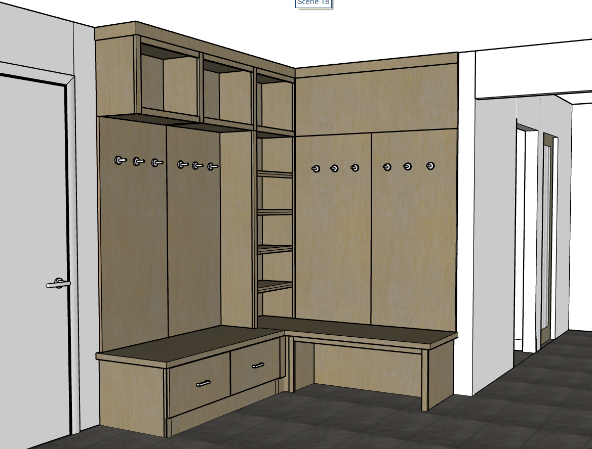 render this mudroom model with light natural wood show towels on the shelves and some robes on the hooks