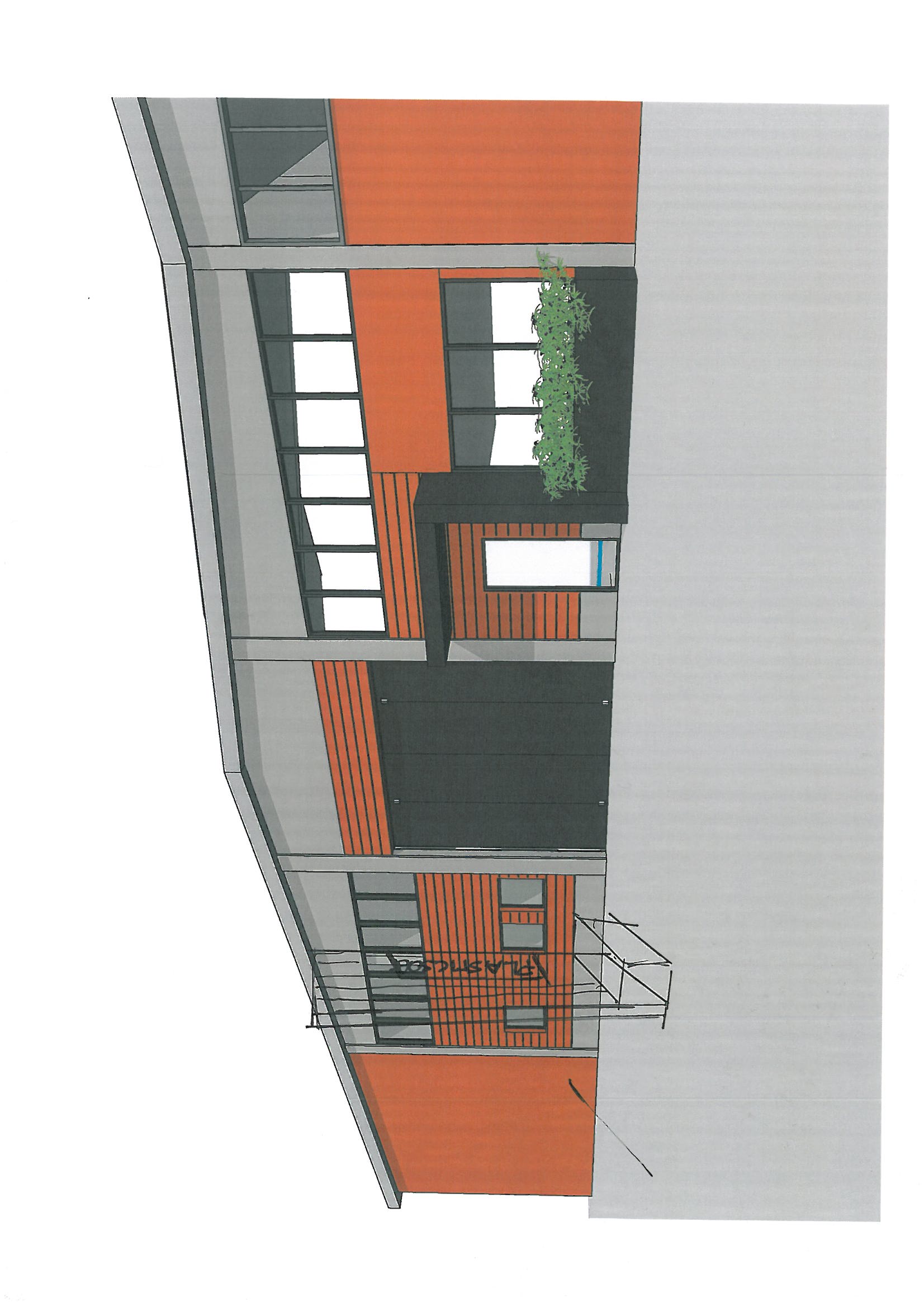 fammi una facciata moderna con mattoni color bianco avorio infissi con telai e portone color testa di moro anche la fioriera di destra e la pensilina di accesso in lamiera color testa di moro e poi fare sulla sinistra come da bozzetto a mano libera una fioriera con un totem inverdito con rampicanti e ivi inserito un logo verticale con la scritta multiprojecta la facciata del capannone color bianco avorio la campata di destra oltre il pilastro deve rimanere con laterizio color cotto e facciata grigia e anche tutta la porzione a sinistra oltre alla fioriera totem