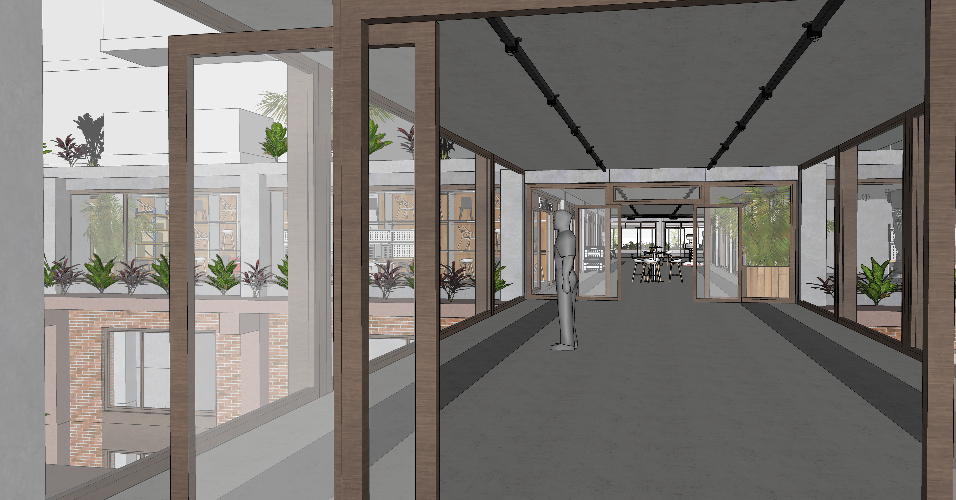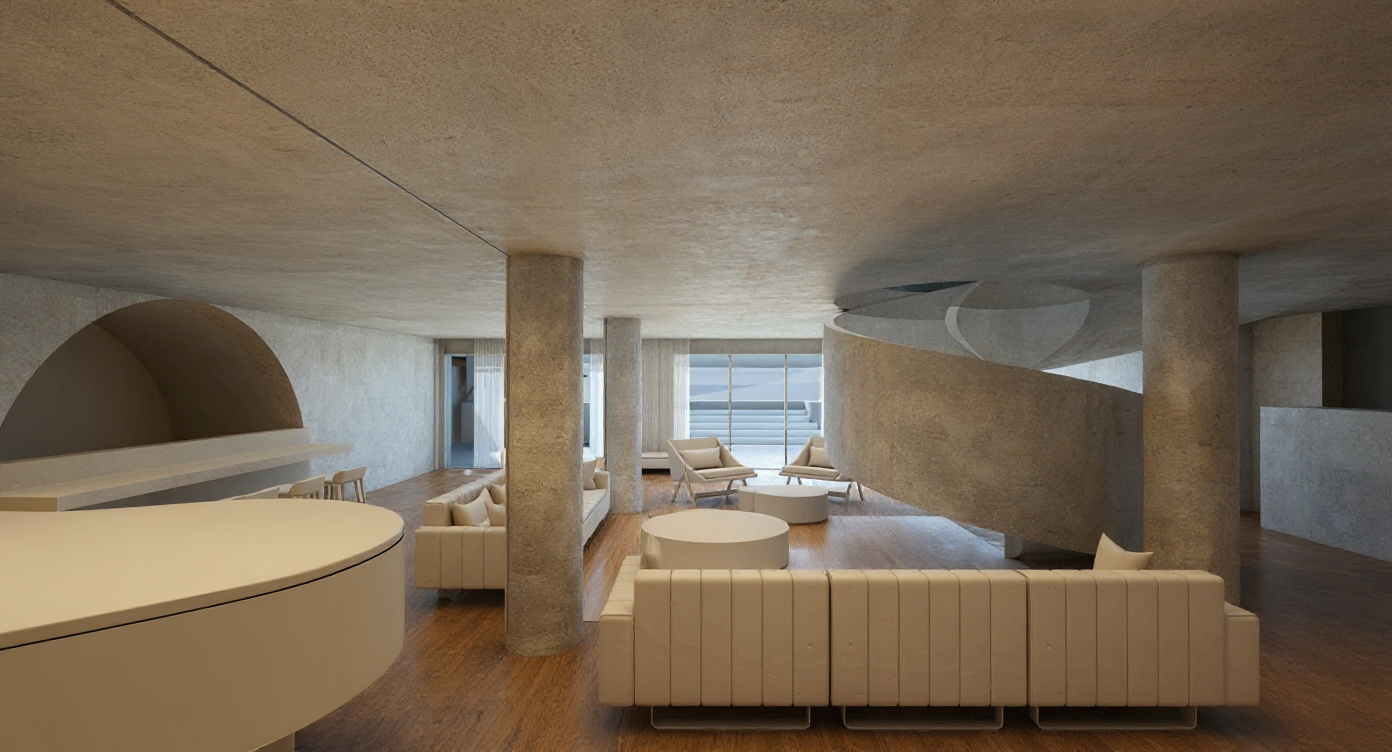 modernist interior shot industrial coworking space wooden details white walls concrete floor light ambience architecture