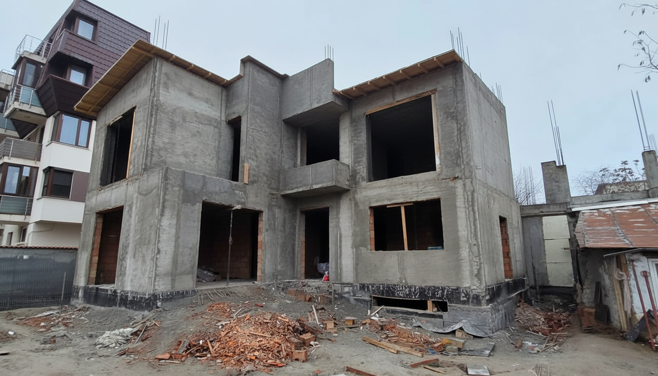 render a modern commercial building with a bold and sleek design don t change any doors windows colors or materials slightly worn concrete parking lot as shown place some buildings in the far background