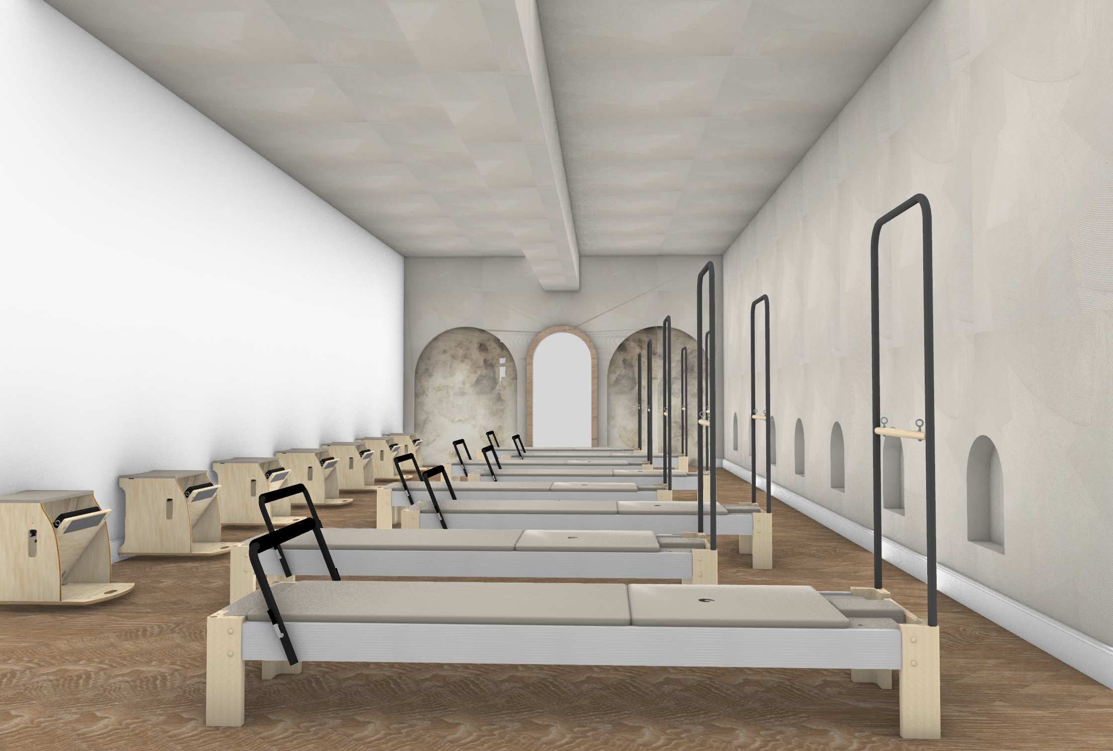 refine the existing image only do not change layout camera angle proportions or placement of any objects do not redesign anything only enhance realism materials and add the specified details enhance materials to a high end photorealistic level flooring as warm natural oak herringbone with rich grain variation and subtle matte reflection walls and ceiling as cream polished plaster with soft texture and tonal variation add enhance the following elements without moving anything add a large full height mirror wall across from the pilates beds integrate a warm led strip light at the base of the mirror soft glow on floor add warm led strip lighting within the arches on the right small niches add minimal pilates accessories rings blocks straps styled neatly lighting soft warm diffused lighting throughout subtle glow from led strips and chandelier realistic shadows reflections and ambient light overall ultra realistic materials pbr subtle imperfections keep everything exactly as is only enhance and layer detail
