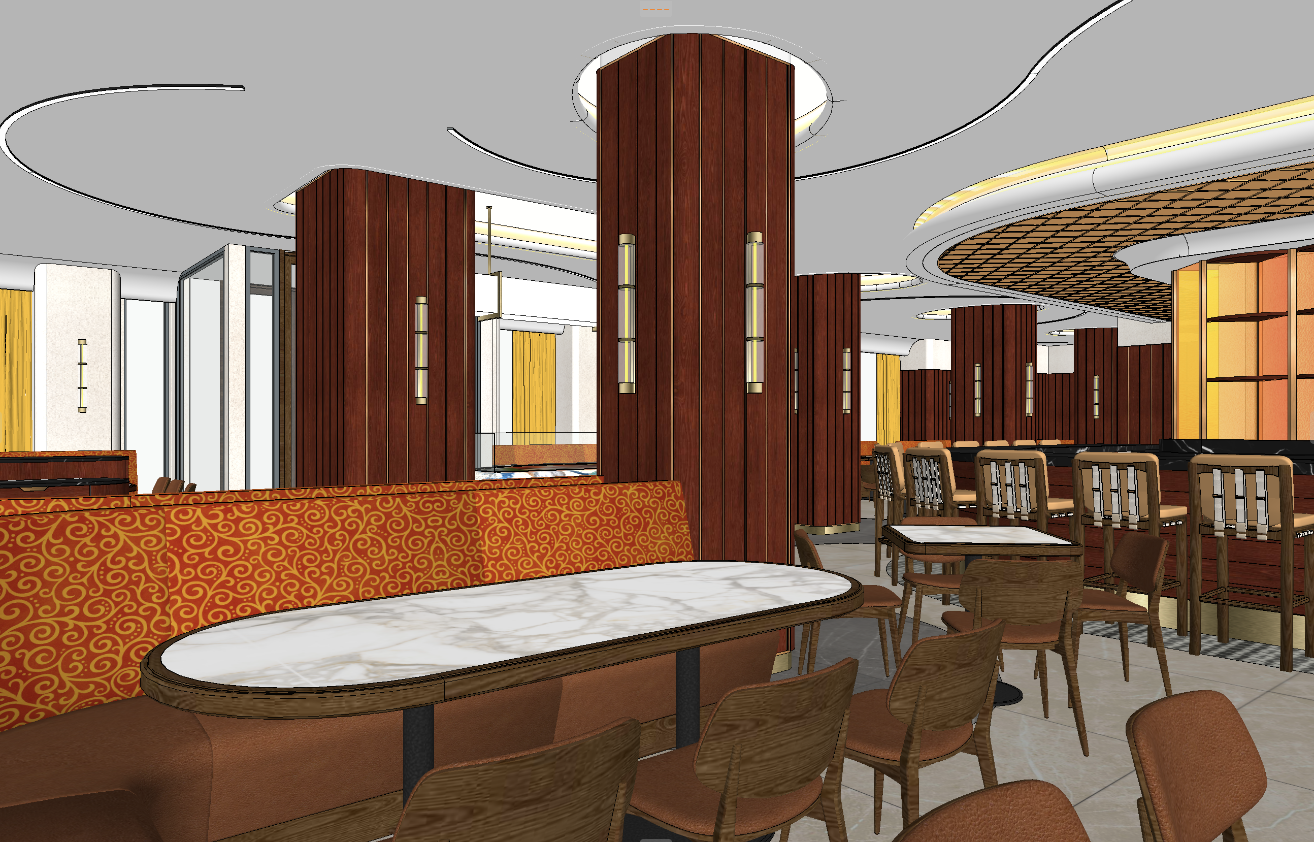 ultra realistic restaurant interior video same camera angle with slow smooth camera movement bright daytime natural light warm 2700k cove lighting on curved ceiling lines mirrored yellow ceiling tiles near the bar area amber glass bar panels palisander wood columns with brass vertical inlays orange patterned velvet banquettes marble tables caramel leather chairs yellow curtains with cove lighting above add lively atmosphere tables fully set with plates glasses cutlery a few guests sitting and talking waiters walking and serving soft movement in curtains and reflections photorealistic materials and elegant ambience