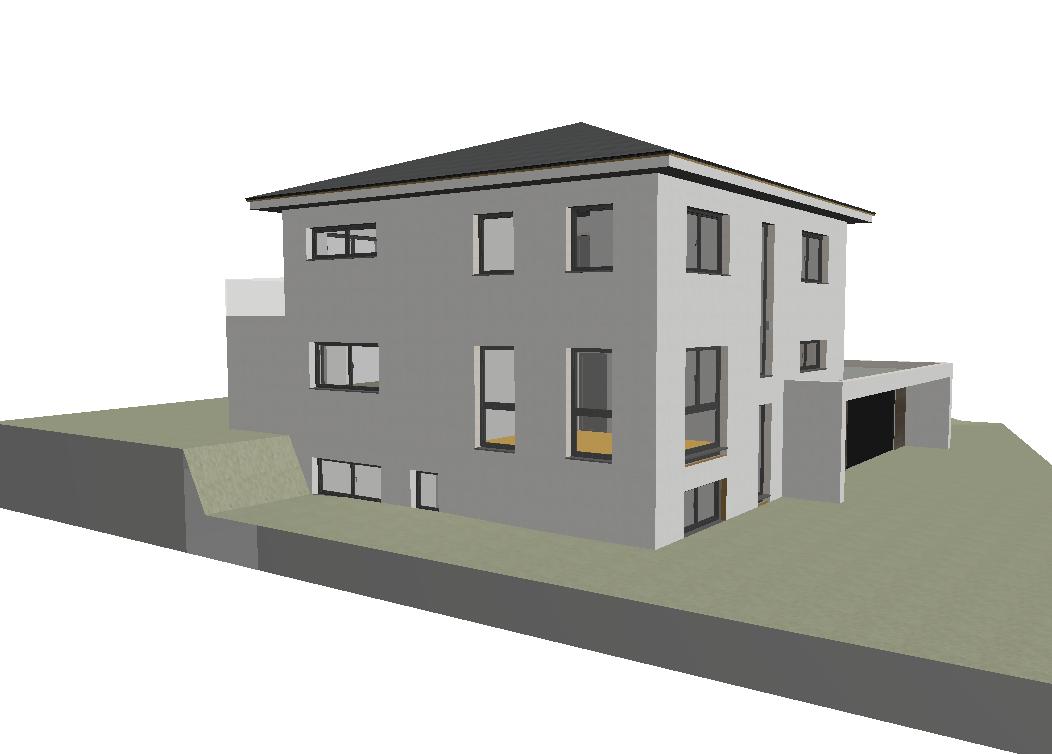 3d render of a modern three story building with a sleek minimalist design create a nice modern frontyard infront of the canopy in the right side of the picture